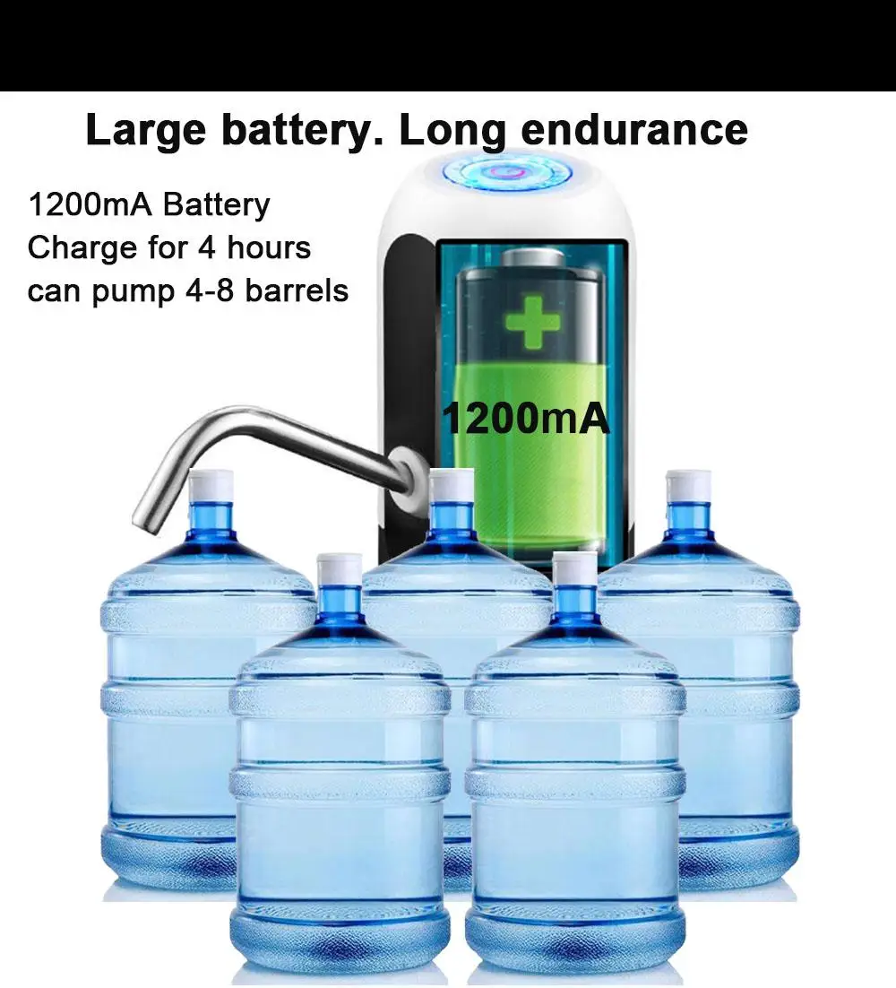 4. Встроенный аккумулятор USB 1200 мАч, используется для 30-40 дней или около 4-6 бутылок воды 5 галлонов после полной зарядки