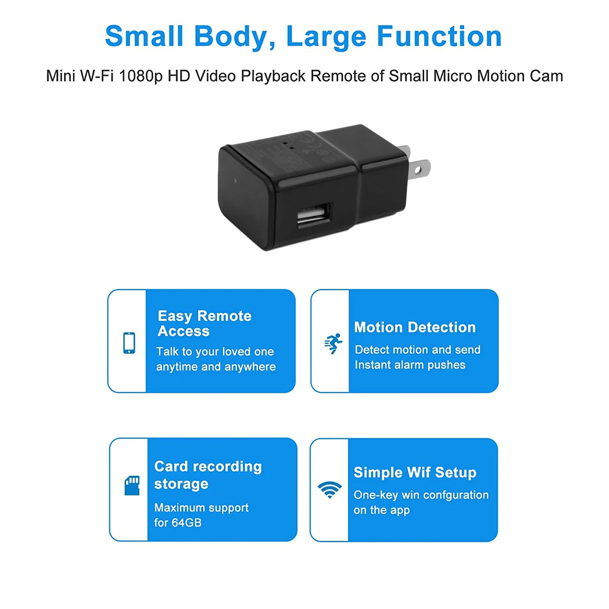 1. Зарядка через USB-камеру: эта камера безопасности также является зарядным устройством через USB, она может записывать видео full HD 1080P во время зарядки устройства без обнаружения, наблюдать за ребенком дома, офисные или автомобильные камеры видеонаблюдения, домашние животные, няня, вор или сотрудники.