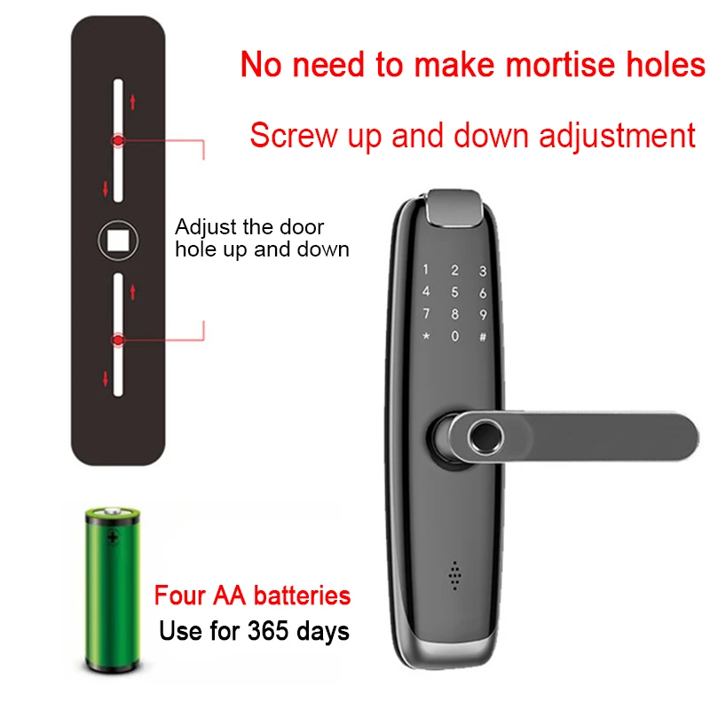 1. Материал: алюминиевый сплав2. Цвет: черный, бронзовый, красный3. Размер: 260*60*21 мм4. Метод разблокировки: приложение Tuya (по умолчанию) + пароль + отпечаток пальца + карта + ключ5. Система поддержки: IOS7.0 или Android 4,4 и выше6. Срок службы батареи: 10000 раз обычно открывается (12 месяцев)7. Источник питания: DC6V, 4 щелочные батареи8. Ток покоя: 45Ua9. Динамический ток: <200 мА10. Разблокировка времени: 0,2 S ≤11. Класс водонепроницаемости: слегка водонепроницаемый, не подходит для дождливой среды12. Изготовление на заказ: оптовые заказы могут быть настроены с логотипом + без отпечатка пальца версии или TTLOCK/Zigbee версии, подходит для отеля/семьи/квартиры/аренда дома и других сцен. Может управлять всеми устройствами в едином диапазоне мобильный телефон. Рекомендуется использовать самый маленький корпус замка для новой двери. Этот замок красивый и дешевый, и качество очень стабильное.