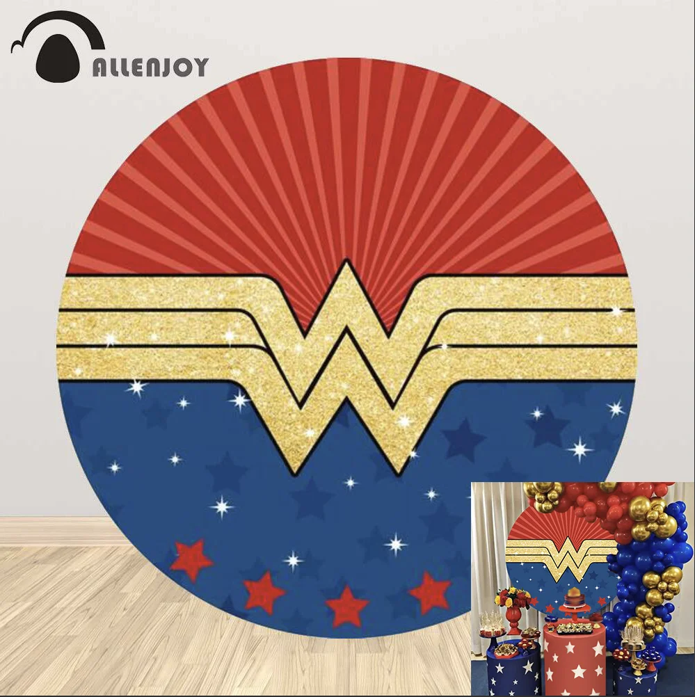 Allenjoyженский круглый фон с изображением супергероя для девочек и детей, вечерние, красные, синие, в полоску, со звездами, на день рождения, с эластичным декором