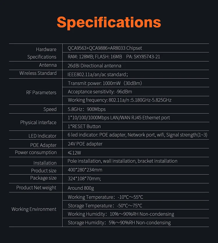 Чипсет: Qualcomm Atheros QCA9563 + QCA9886 + AR8033 CPU ,128 МБ RAM, 16 Мб FLASH , SKY85743-21 PAАнтенна: 26dBi направленная антенна в форме бабочки с высоким коэффициентом усиленияСтандарт беспроводной связи: EEE802.11a/an/ac стандартРЧ параметры: Мощность передачи: 1000 мВт (30 дБм)Чувствительность приема: -96 дБмРабочая частота: 802. 11a/n: 5. 180 ГГц-5,825 ГГцСкорость передачи: 5,8 ГГц: 900 Мбит/с