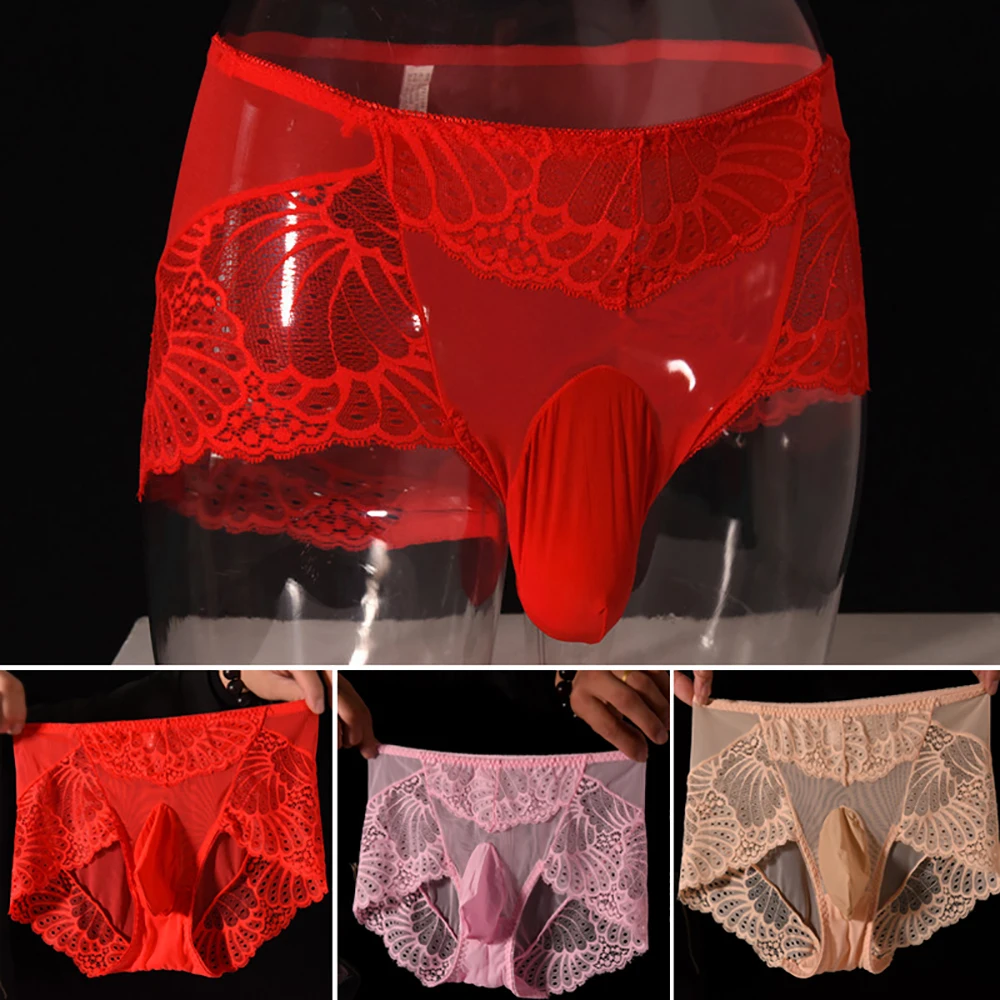 Трусы мужские кружевные с низкой посадкой, пикантные дышащие трусы, Прозрачное нижнее белье, с карманом, с выпуклым мешочком, большие размеры