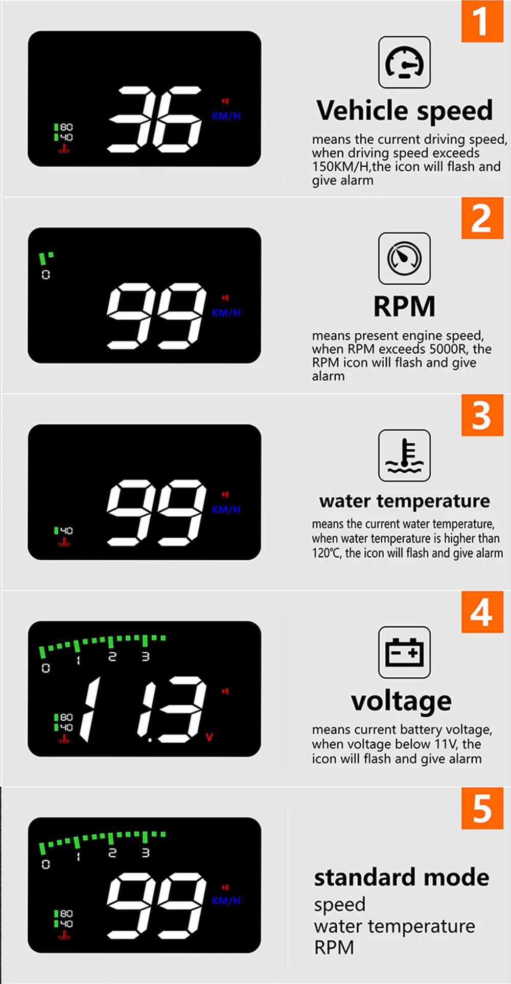 5. Богатое содержание: скорость, об/мин, температура воды, напряжение, одиночное расстояние вождения, Сигнализация низкого напряжения, сигнализация с высокой температурой воды, сигнализация с превышением скорости, свободное переключение между километрами и милями.