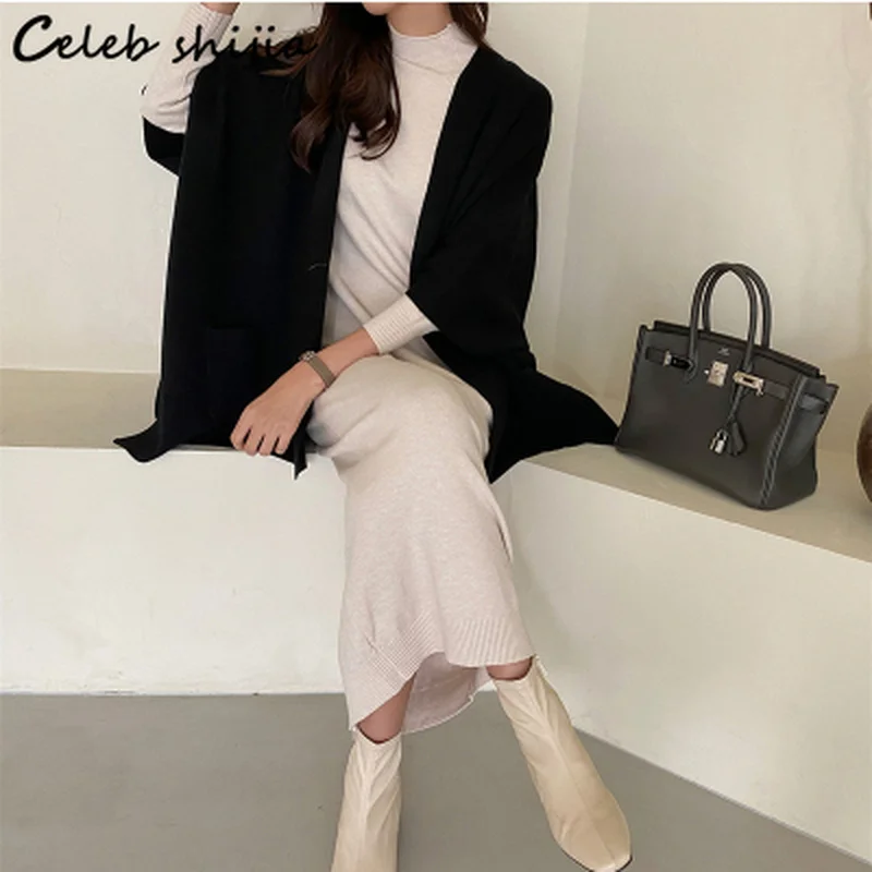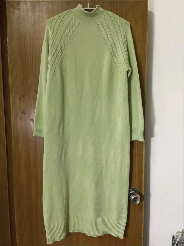 Женское шерстяное платье-макси, Длинное свободное трикотажное зеленое платье-свитер с высоким воротником в Корейском стиле на осень и зиму