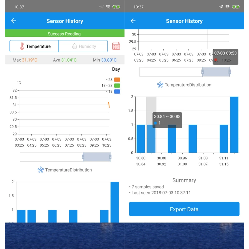✔Хранение и экспорт данных:Поддержка экспорта данных через CSV. Храните данные в течение 20 дней, если интервал выборки составляет 1 мин, а максимальная дата хранения составляет 30000 баллов. Может быть установлен различный интервал выборки.(10s/ 30s/ 1min/ 2mins/ 5mins/ 10mins/ 30mins) Экономия времени передачи данных будет отличаться, если вы выберете другой интервал выборки.