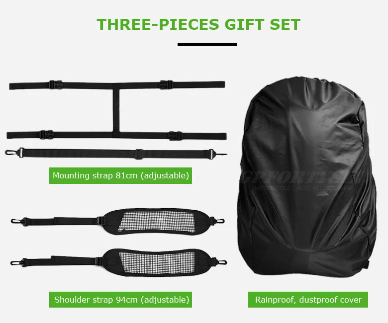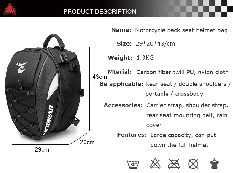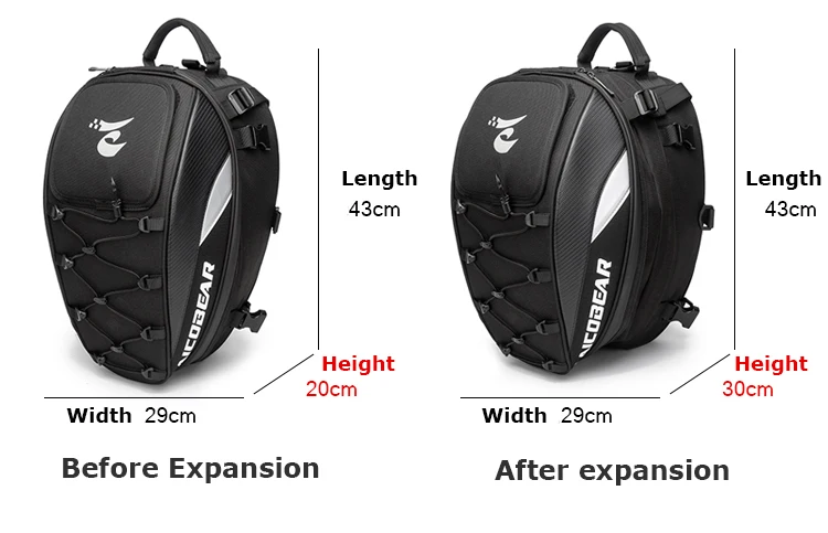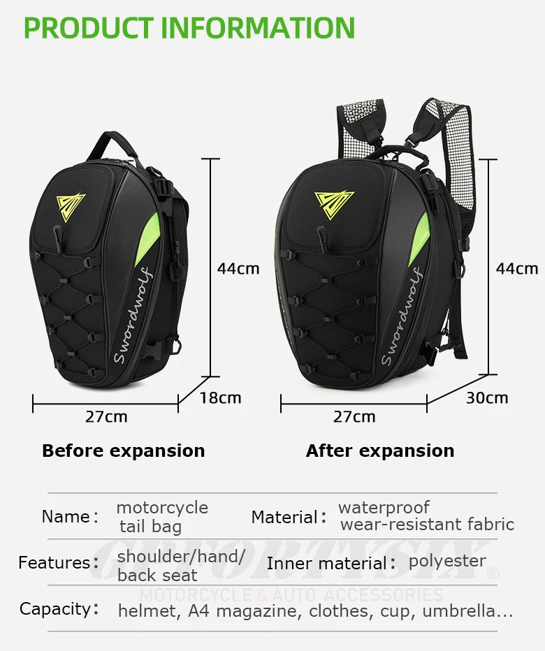 Информация:Модель: 11-MC-0102Цвет: красный, черный, зеленый, серый светоотражающийМатериал: утолщенная водоотталкивающая оксфордская ткань + Размер рисунка из углеродного волокна (прибл.): до: 29*20*43 см/11,42*7,87*16,93 дюйма. После: 29*30*43/11.42*11,81*16,93 дюйма.Вес: около кгПрименимо: хвост, рюкзак, сумка-тоут, КроссбодиАксессуары: поясной ремень, ремень, плечевой ременьПосылка: 1 мотоциклетная сумка