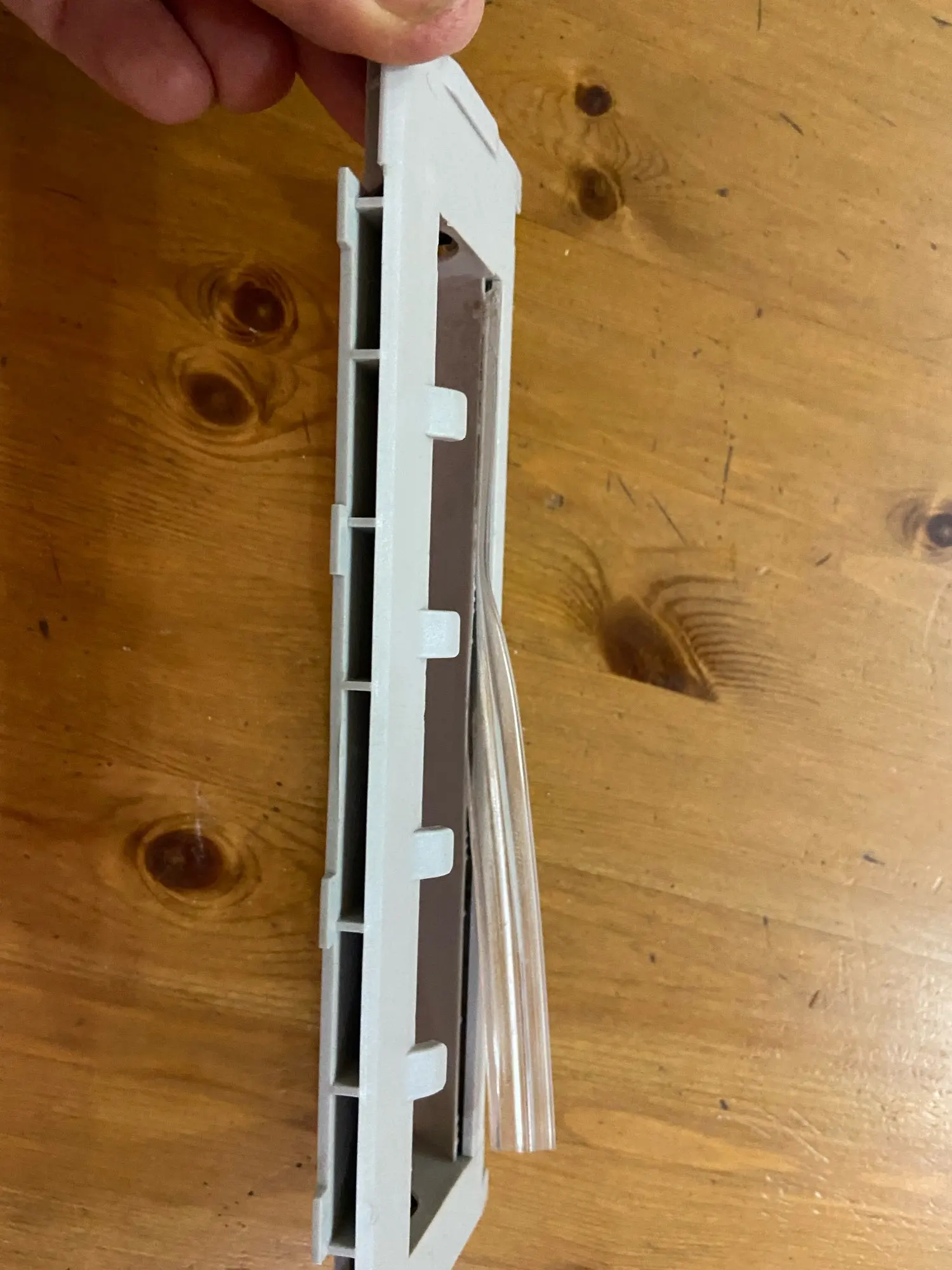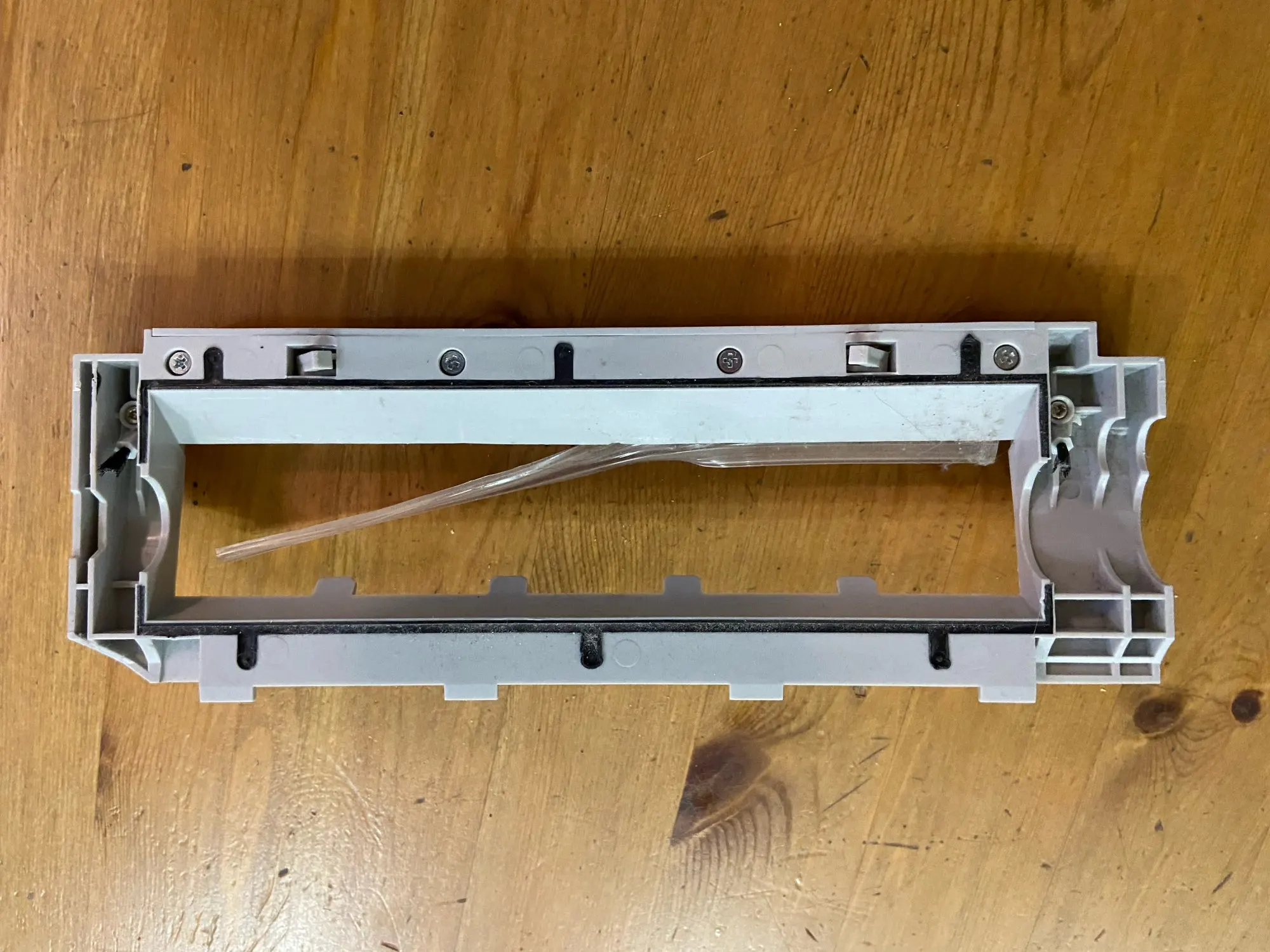 Очень жесткая и не гибкая «силиконовая» полоска. После месяца использования её вывернуло. Вставил обратно, пока держится. У оригинальной рамки, эта полоска была более гибкой и мягкой, но порвалась об саморез в полу. По размерам подошла.