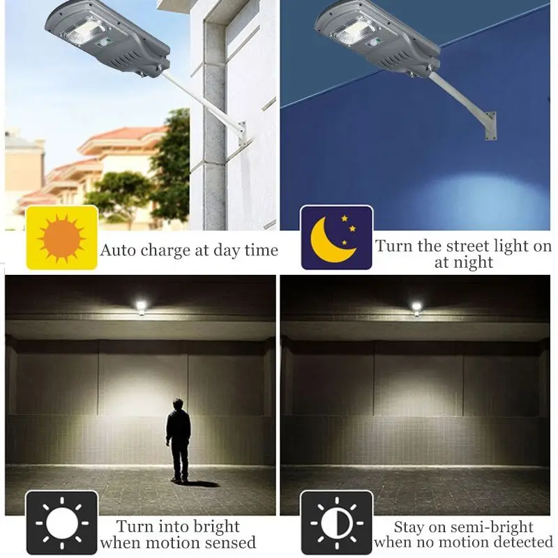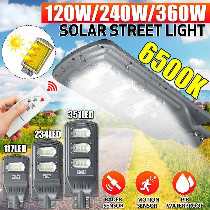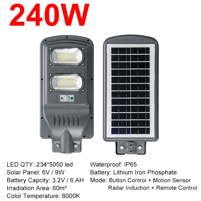 Особенности:-117 / 234 / 351 светодиодных ламп высокой яркости 5050, энергосберегающие, равномерсветильник долговечные.-Поликристаллическая солнечная панель преобразует солнечную энергию в электричество, более экологически чистая.-Технология измерения человеческого тела делает его более энергоэффективным, включается при обнаружении движения, тусклсветильник при отсутствии движения.-Солнечные панели преобразуют солнечную энергию в электричество, более экологически чистые.-Корпус из АБС-пластика, высокая твердость, герметичность и водонепроницаемость ip65.-Простая установка, безуходная надежная работа без необходимости подключения проводки или траншеи. Нержавеющий, водонепроницаемый алюминиевый сверхпрочный корпус.-Пожалуйста, включите переключатель перед установкой или зарядкой.-Применение: наружная стена или шест на площади, парке, саду, дворе, улице, дорожке, тропинке, кемпинге, ферме, безопасности по периметру и т. д.Характеристики:Материал корпуса: абс + ПКИсточник светильник: 5050 светодиодных лампочек высокой яркости (ярче, устойчивее к температурам)Цветовая температура: 6500K (холодный белый)Уровень водонепроницаемости: 95% герметичная Водонепроницаемость (дождь)Система управления: кнопочное управление + датчик движения + индукция рада-r + пульт дистанционного управленияУгол срабатывания: 120 градусовЭффективный диапазон: 5 - 8 метровСтепень водонепроницаемости: IP66Время солнечного света: около 12 часовИсточник питания: Встроенный литий-железо-фосфатный аккумуляторСветильник: белыйЦвет корпуса: серыйМатериал: АБСТовар:Мощность: 120 ВтКол-во светодиодов: 117*3528 светодиодовСолнечная панель: поликристаллическая солнечная панель 6 в/7 ВтЕмкость аккумулятора: литий-железо-фосфатный аккумулятор 3,2 В/6 АчРежим: кнопочное управление + датчик движения + индукция рада-r + пульт дистанционного управленияПлощадь облучения: 50 квадратных метровМощность: 240 ВтКол-во светодиодов: 234*3528 светодиодовСолнечная панель: поликристаллическая солнечная панель 6 в/9 ВтЕмкость аккумулятора: литий-железо-фосфатный аккумулятор 3,2 В/6 АчРежим: кнопочное управление + датчик движения + индукция рада-r + пульт дистанционного управленияПлощадь облучения: 60 квадратных метровМощность: 360 ВтКол-во светодиодов: 351*3528 светодиодовСолнечная панель: поликристаллическая солнечная панель 6 в/13 ВтЕмкость аккумулятора: литий-железо-фосфатный аккумулятор 3,2 В/12 АчРежим: кнопочное управление + датчик движения + индукция рада-r + пульт дистанционного управленияПлощадь облучения: 80 квадратных метровПосылка1 солнечный уличный фонарь 120/240/360 Вт