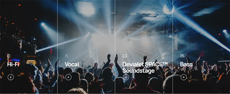 Индивидуальные звуковые эффектыЧетыре звуковых эффекта на Ваш выбор: Hi-Fi,Vocal, Devialet SPACE™Звуковая сцена и бас.