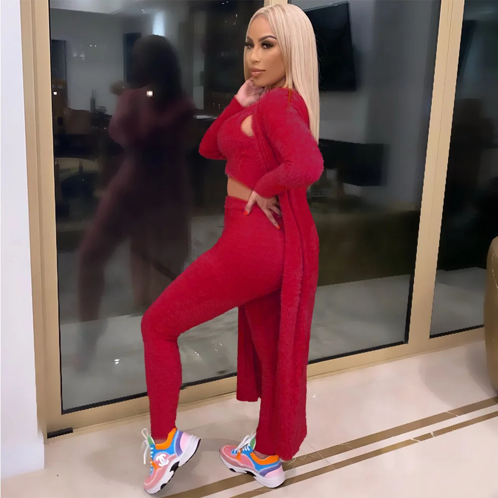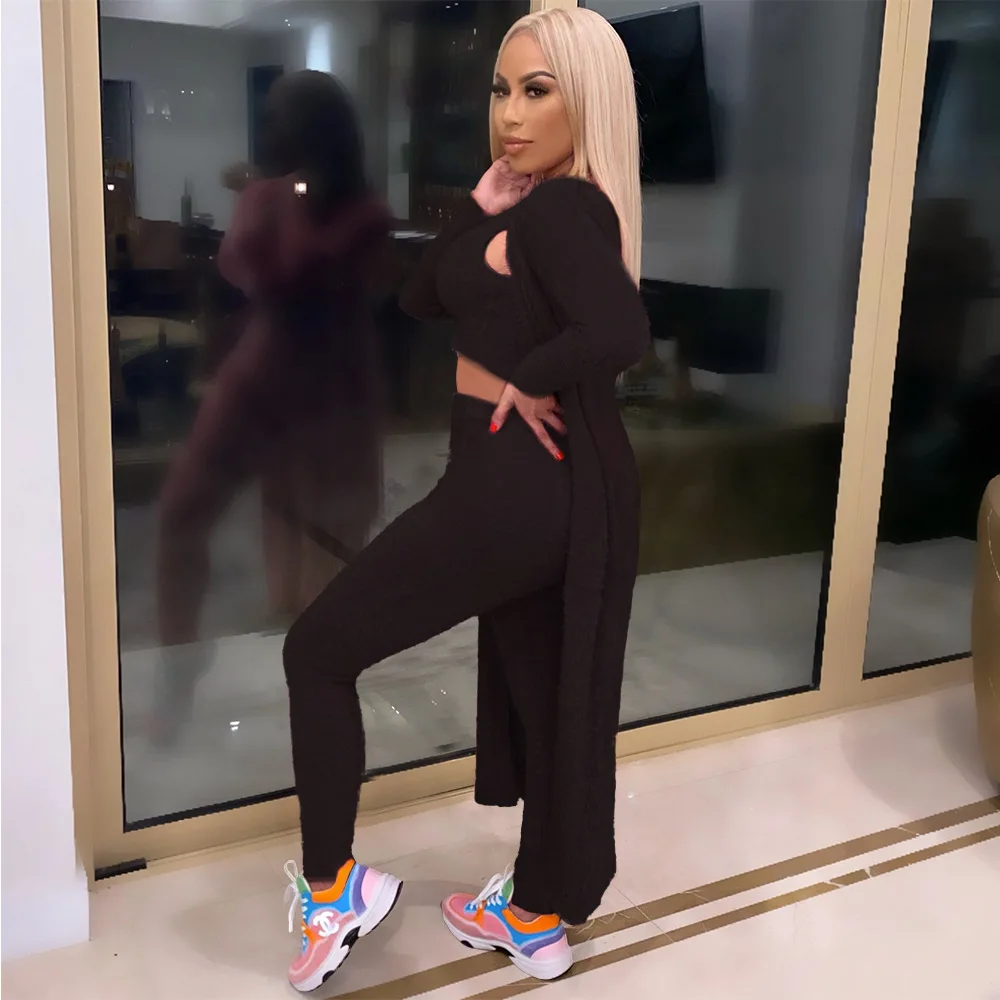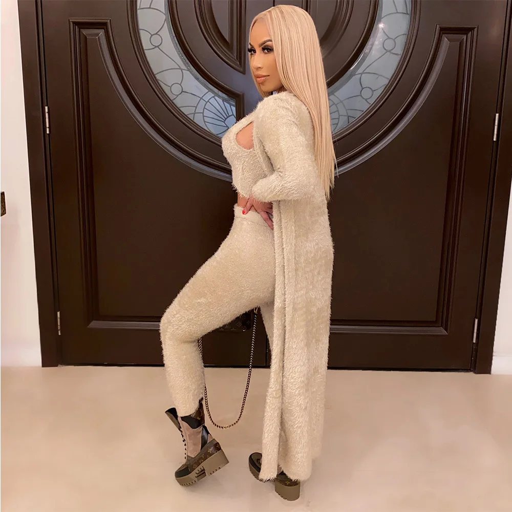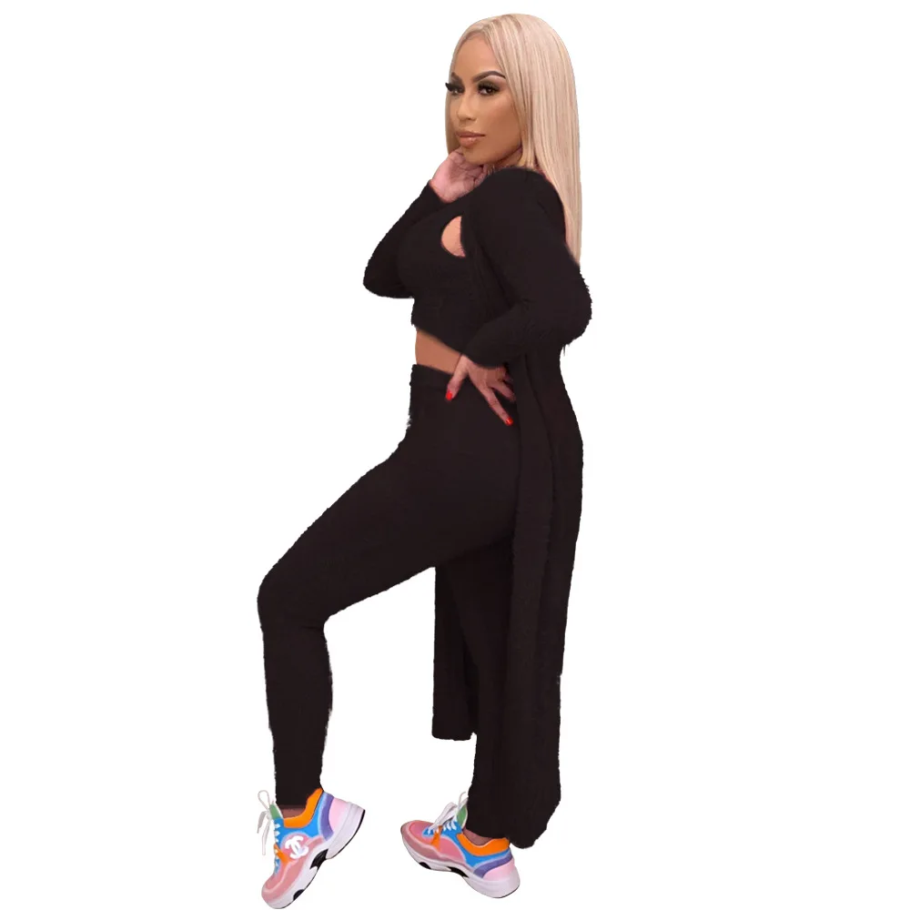 Женский комплект из 3 предметов, зимний сексуальный пушистый флисовый длинный кардиган с круглым вырезом, укороченный топ, штаны с высокой талией, комплект одежды для отдыха