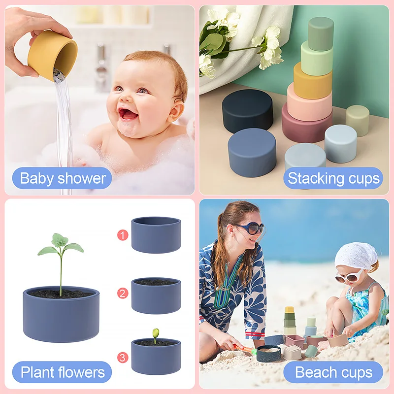 Прочные гладкие силиконовые чашки имеют хороший размер для маленьких рук, чашки для укладки и склеивания могут предоставить возможность играть с вашим ребенком, когда он простаивает, чашки игрушки могут быть отличным тренировочным стаканчиком для малышей, для поддержки питья ребенка самостоятельно, кроме того, набор детских строительных чашек может быть идеальным украшением