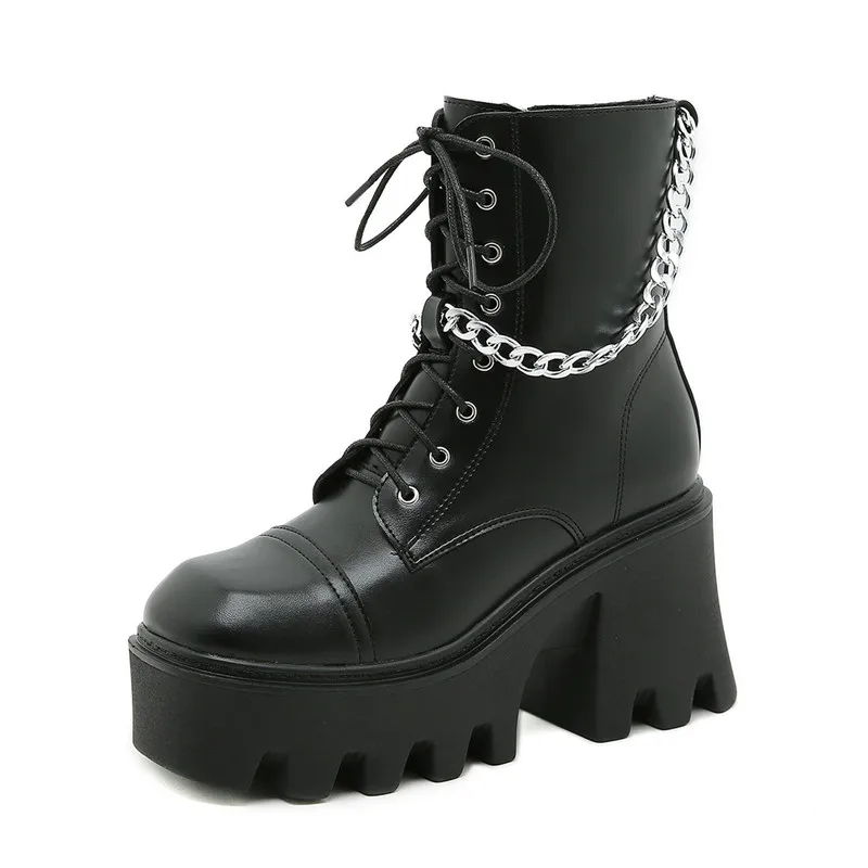 Черные Готические мотоциклетные ботинки с цепочкой, дизайнерские ботинки на платформе, женские ботинки в стиле панк, модная обувь на высоком каблуке, женская обувь