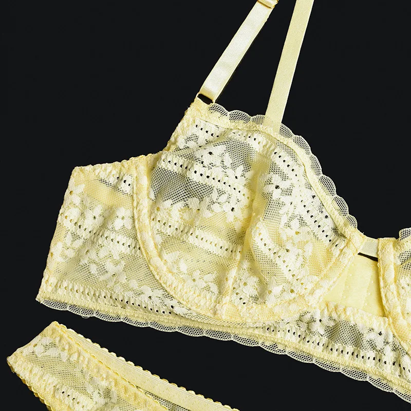 Женское сексуальное нижнее белье с вышивкой желтого цвета, Комплект эротического нижнего белья из бюстгальтера и трусов с подвязками, чувственное кружевное нижнее белье