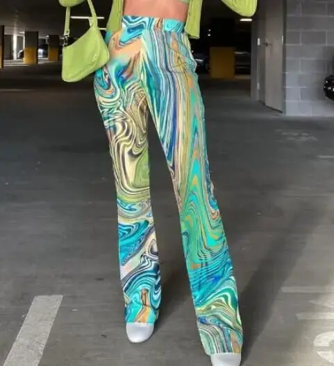 Женские брюки-клеш с высокой талией, облегающие длинные брюки с волнистым принтом, летняя Клубная уличная одежда, женские брюки с колокольчиками, Размеры SML