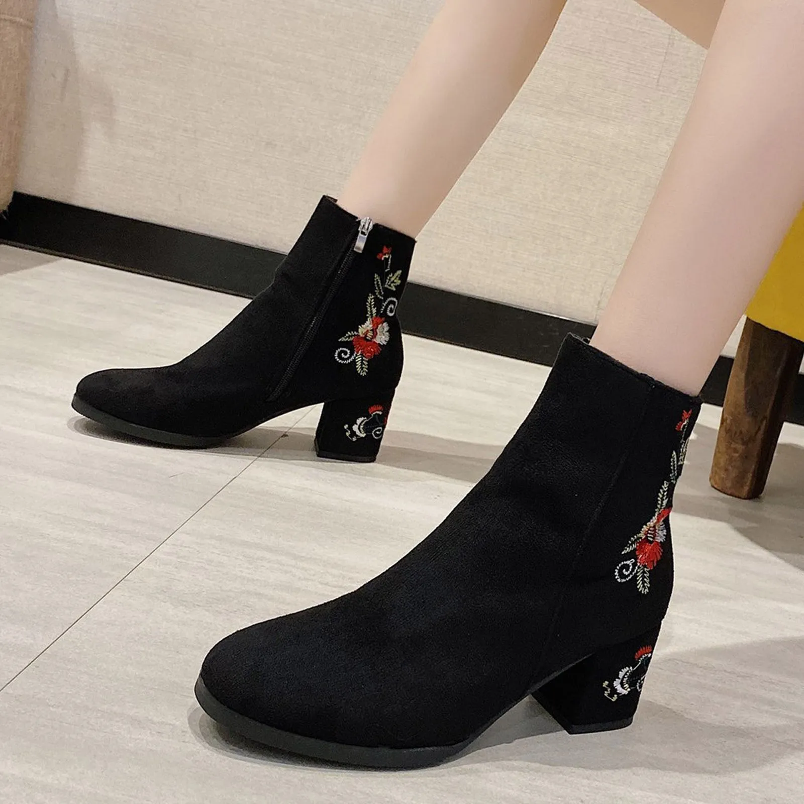 Женские ботинки в стиле ретро, теплые короткие ботильоны из флока с вышивкой, на квадратном каблуке, на молнии, с круглым носком, Осень-зима