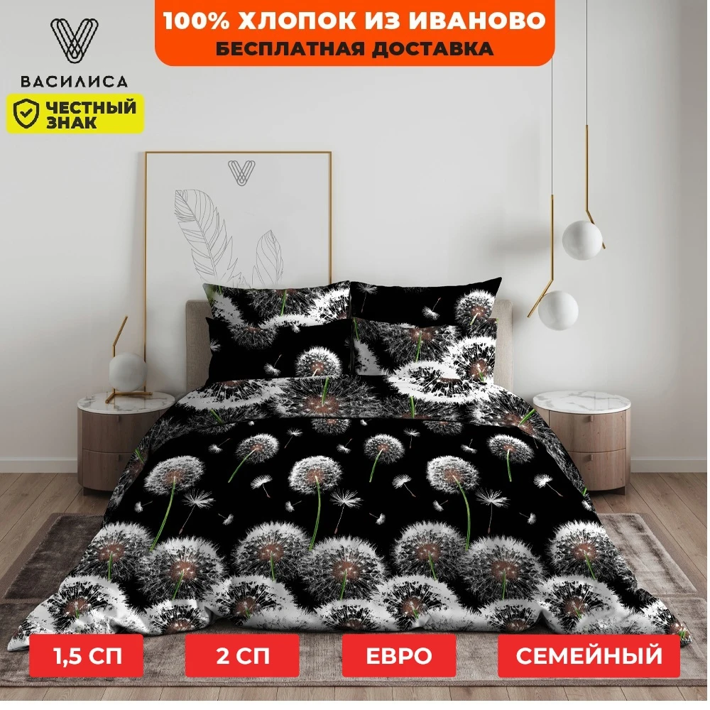 Комплект постельного белья "Белые одуванчики" выполнен в двух основных цветах, черный цвет изысканности и солидности и белый цвет открытости, чистоты и свободы, воздушные силуэты одуванчиков добавляют комплекту легкости, свободы и безмятежности. Постельное белье от бренда "Василиса", изготовлено из 100%-хлопка ткань бязь, умеренной плотности 120 гр. Натуральный хлопок абсолютно экологичен, не вызывает аллергии, хорошо пропускает воздух, позволяя телу дышать. При соблюдении рекомендаций по уходу, ткань легко стирается, не дает усадки и практически не мнется, позволяя гладить белье без отпаривания. Небольшой эффект накрахмаленной ткани позволяет идеально держать форму, меньше загрязняется и сминается, что позволяет сохранить эстетический вид изделия во время эксплуатации. Высокая плотность скрутки нитей ткани не подвержена образованию катышков. Способ застегивания наволочки – клапан, шириной 25 см, что очень комфортно, при использовании наволочка не раскрывается, пододеяльника - отверстие без застежки по краю изделия с подвернутым краем. А красивая современная упаковка как неотъемлемая часть подарка, для Вас и Ваших близких, неся радость и чувство предвкушения.