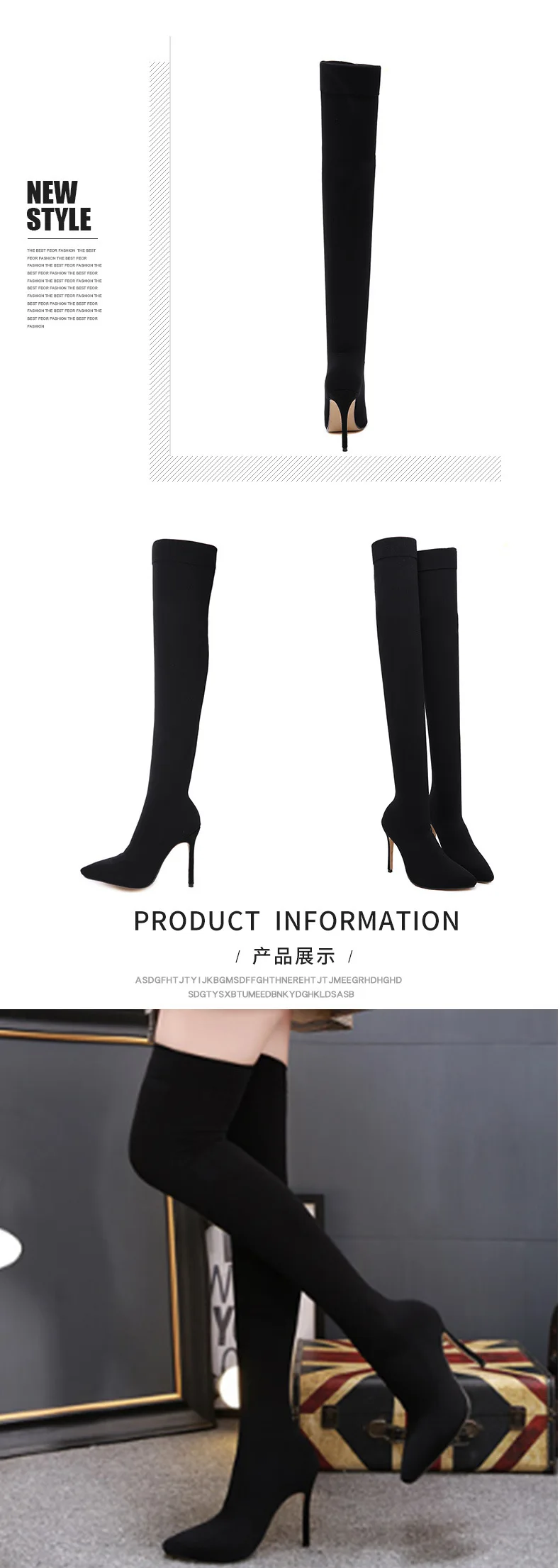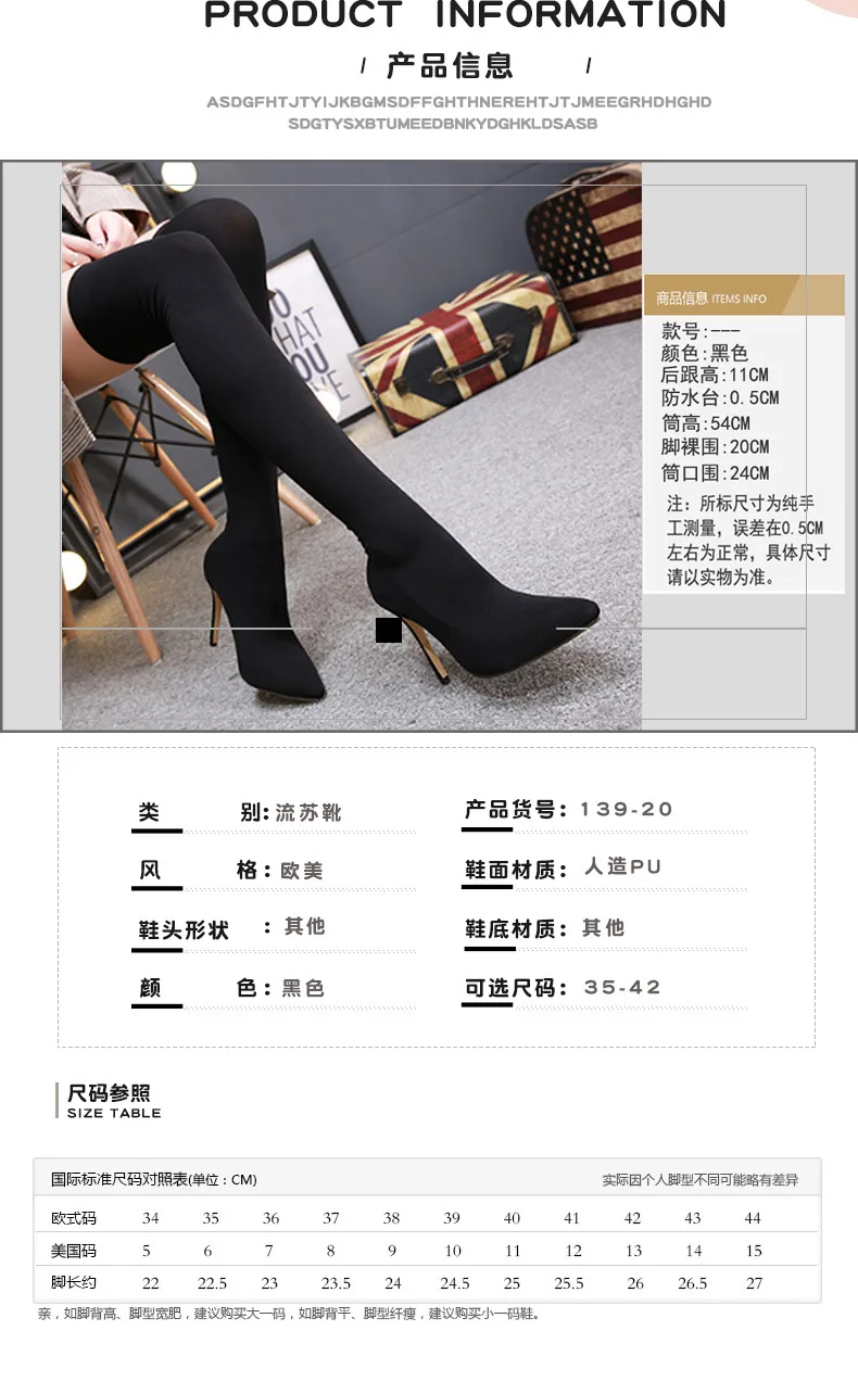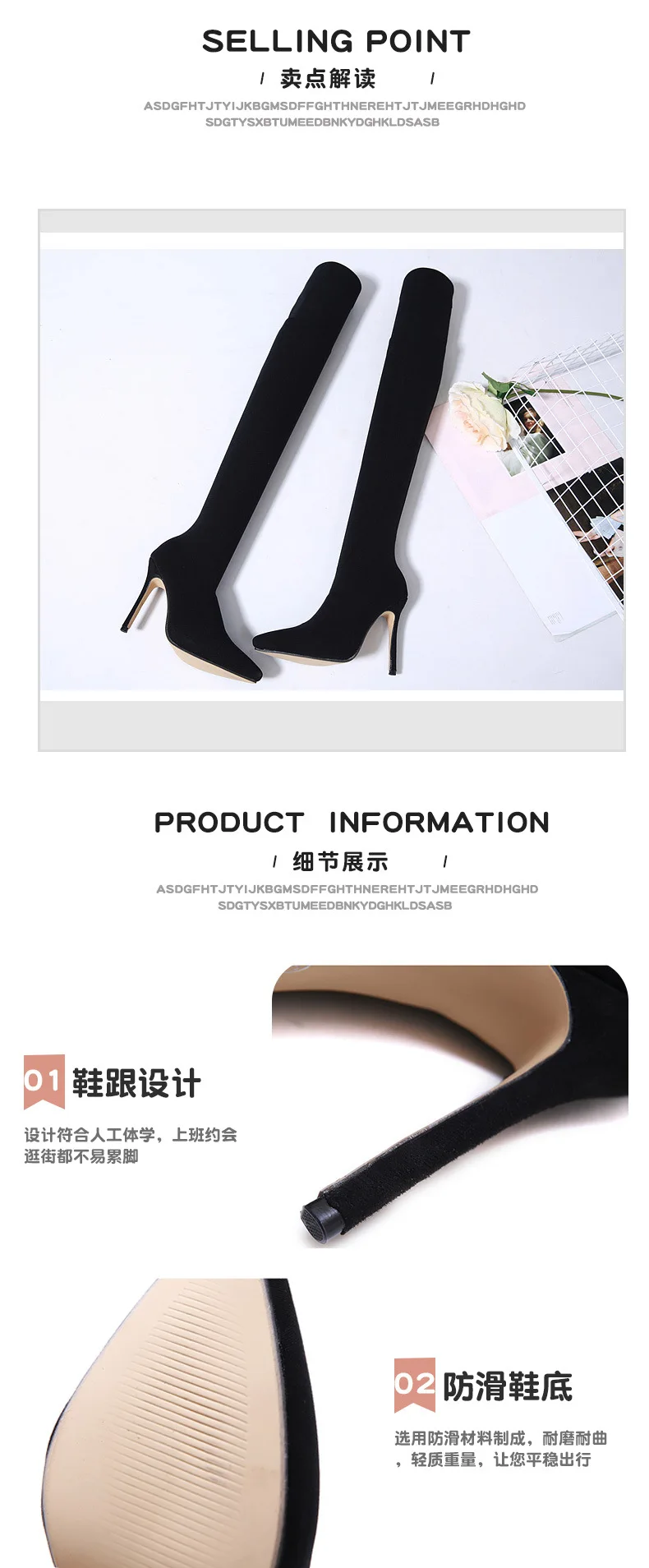 Женские сапоги выше колена, на тонком высоком каблуке, с острым носком