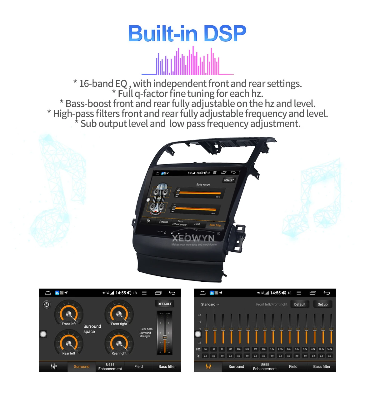 Процессор: Intel X86-OCTA-CORE 1,8 GHZ USI7862Чип усилителя: TDA7851, радиочип: NXP6686.1) Встроенный DSP* 32-полосным эквалайзером, с независимым передние и задние настройки.* Полная q-factor тонкая настройка для каждого Гц.* Усилитель басов спереди и сзади полностью регулируется на Гц и уровне.* Высокопроходные фильтры Передняя и задняя полностью Регулируемая частота и уровень. * Субвыходной уровень и низкочастотная регулировка.2) быстрая загрузка30-40s в первый раз загрузки.В следующий раз, когда вы загружаетесь, после того, как Положите ключ в машину, он начнет работать быстро. И войдите в пользовательский интерфейс в 2S, если вам не нужно быстрое отключение загрузки, вы можете отключить режим сна в настройках.3) Поддержка gps-навигации, Bluetooth, картинка в картинке, многозадачность сплит-экрана, управление рулевым колесом.Примечание: в головном устройстве нет слота для DVD. Он не поддерживает dvd. И не поддерживает видео.