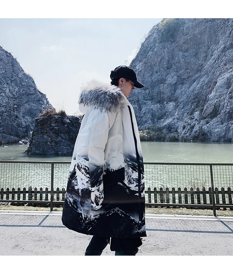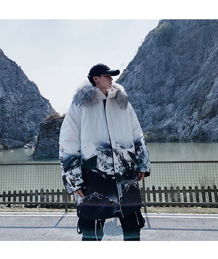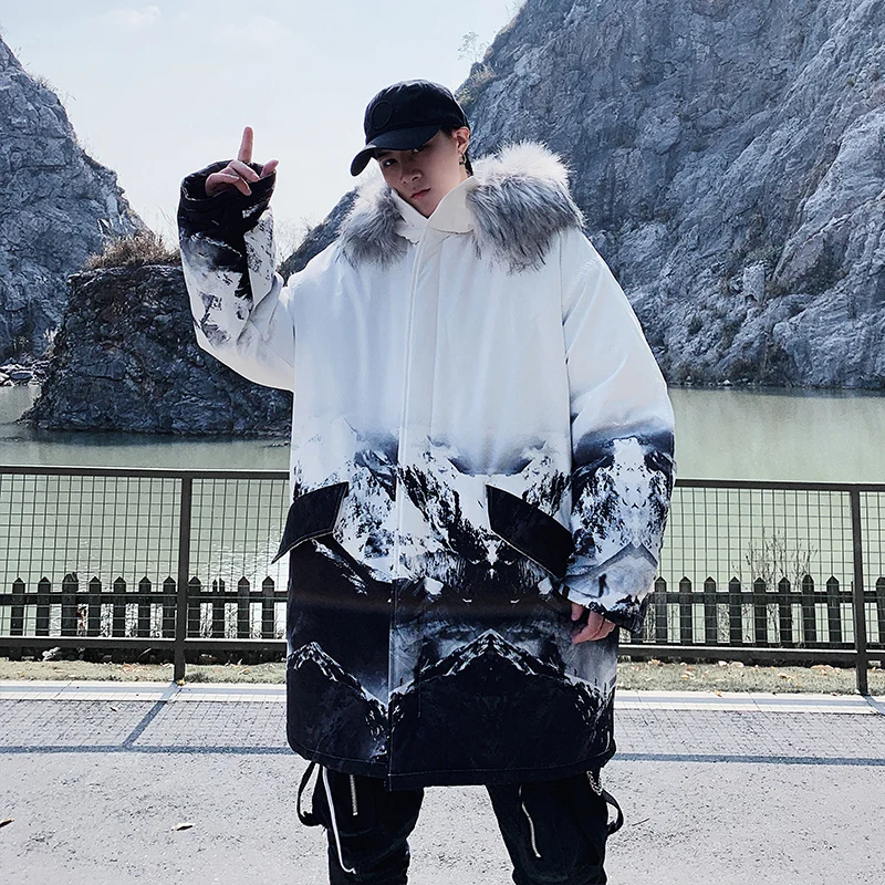 Мужская утолщенная теплая парка, зимнее пальто со съемным капюшоном из искусственного меха, Корейская уличная одежда, пальто с Горным принтом, мужская одежда