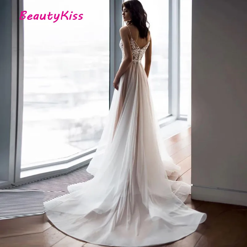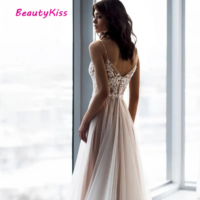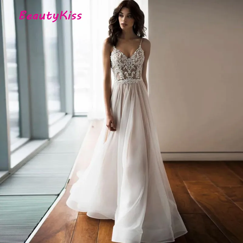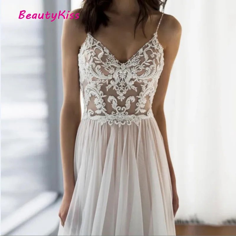 Свадебное платье в стиле бохо, ТРАПЕЦИЕВИДНОЕ кружевное платье на бретелях-спагетти с открытой спиной и аппликацией, платье невесты со шлейфом, 2021