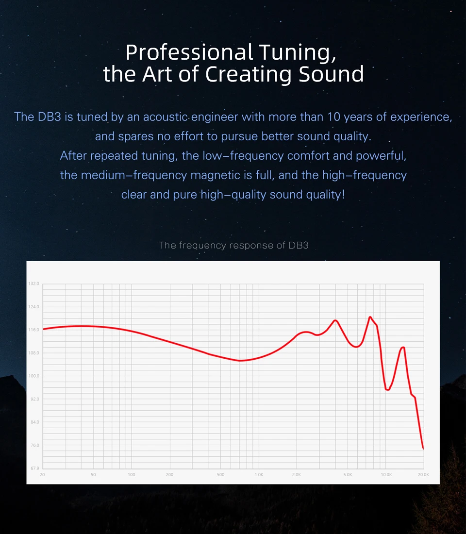 NiceHCK DB3 использует тройную настройку драйвера с одним сбалансированным приводом и двойным динамическим драйвером. С каждым драйвером, регулирующим определенный частотный диапазон, вы сможете наслаждаться более детальным музыкальным опытом, с хорошим разделением инструмента и живой звуковой подписью.