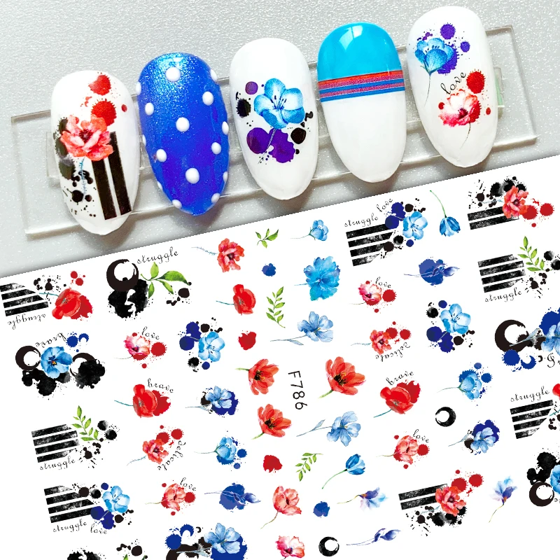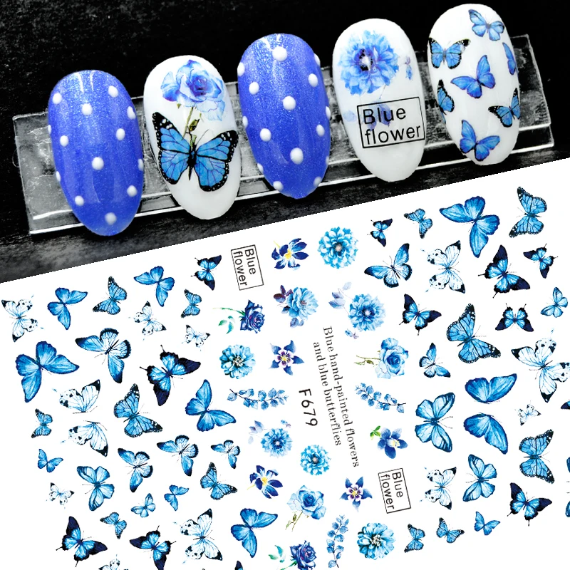 Наклейки для ногтей с бабочками и цветами, цветные, синие, клейкие ...