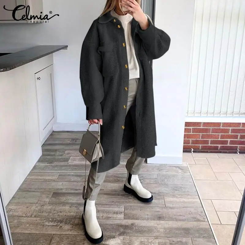 2021 зимние теплые женские флисовые пальто Celmia с длинным рукавом, искусственное пальто, Повседневная Свободная шерстяная пушистая верхняя одежда на пуговицах, длинная одежда