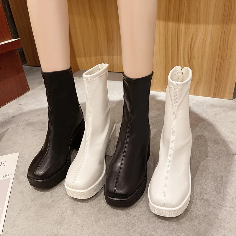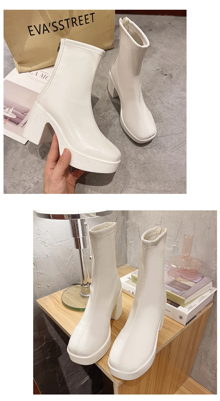 Женские винтажные ботильоны на платформе, однотонные белые ботинки с круглым носком, на толстом высоком каблуке 8 см, осень 2021