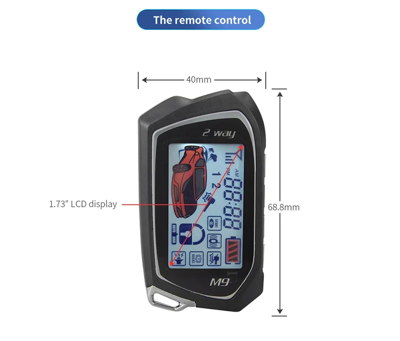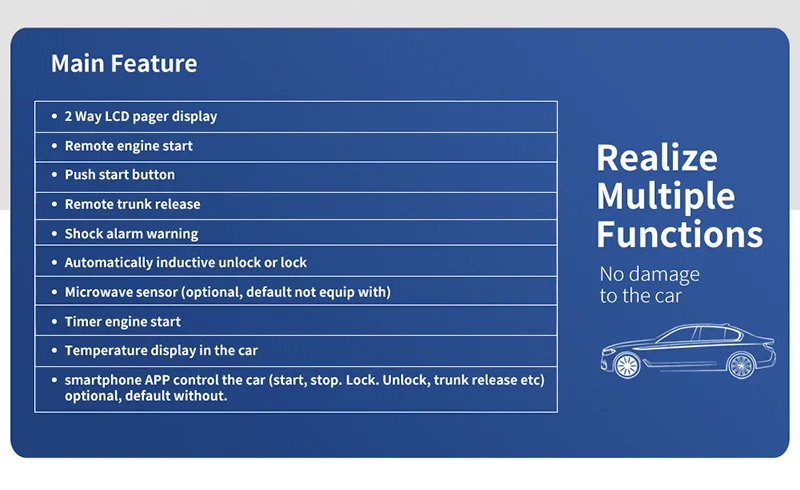 Основные характеристики:2-сторонняя автомобильная сигнализация с ЖК-дисплеемДлинное Дистанционное рабочее расстояние (см. Выше Примечание)Дистанционный запуск двигателяРежим турботаймераПредупреждение о тревоге