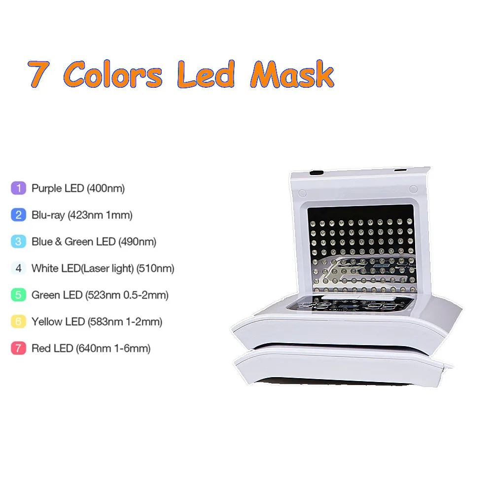 1. Красный (640 нм): глубокий ремонт и Повышение эластичности кожи. 2. Синий (415 нм): удаляет акне и подавляет бактерии. 3. Желтый (590 нм): улучшает морщины и повышает иммунитет. 4. Зеленый (532 нм): осветляет и успокаивает кожу. 5. Фиолетовый: улучшает тонкие линии 6. Голубой: глубокий обмен веществ и контроль жирности. 7. Белый: семицветное световое покрытие