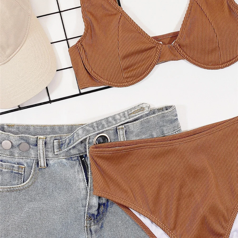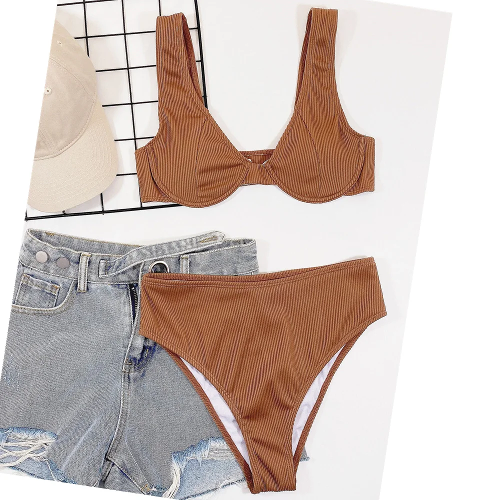 Ребристые коричневый купальники Для женщин Высокая Талия бикини 202...
