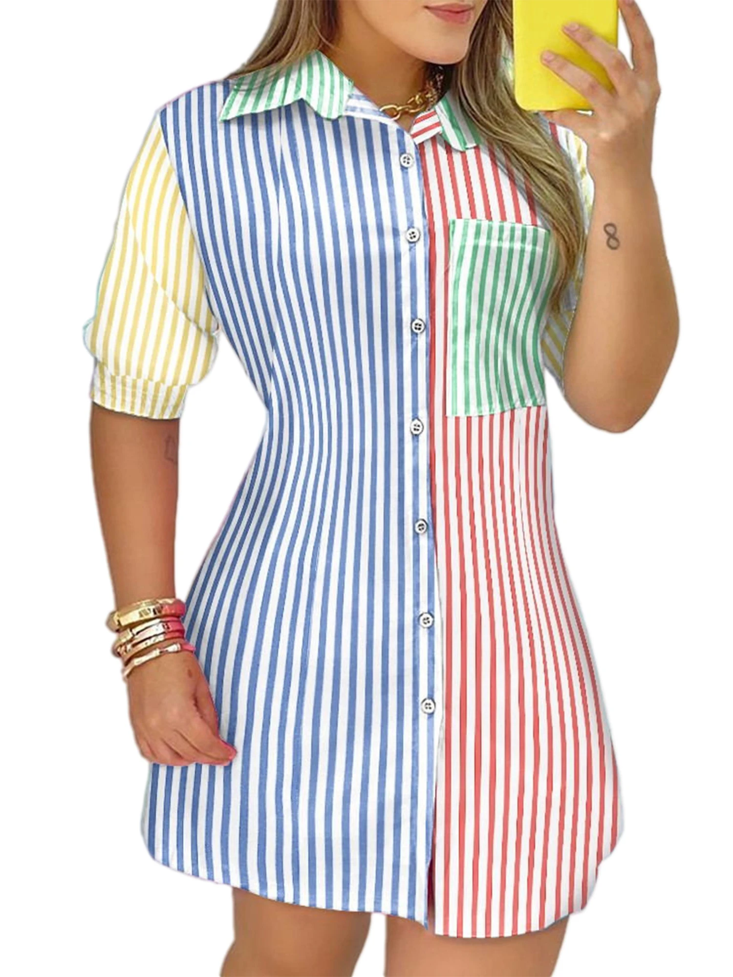 Hirigin размера плюс женская длинная рубашка с коротким рукавом топы радужные разноцветныес принтом отложным воротником платье Блузка