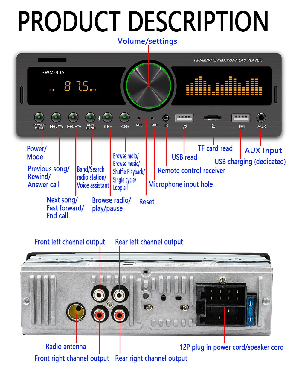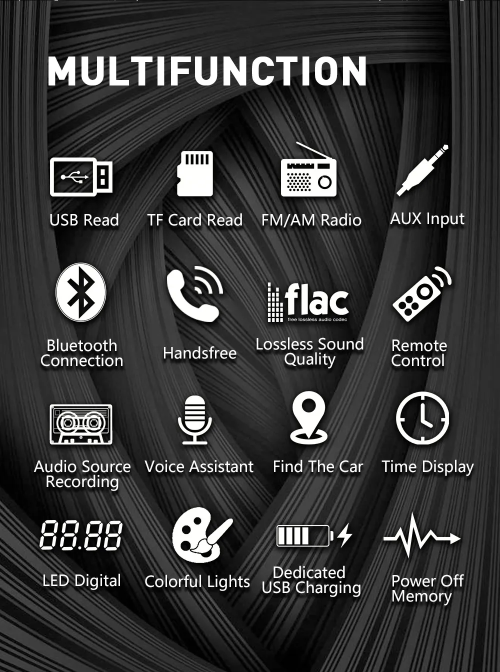 Специальное Перо:1. Голосовой помощник.2. Найдите автомобиль (Только для option''BT find Radio'') Через бесплатное приложение.(После парковки телефон может запомнить место парковки и перейти к тому месту, где в то время была парковка)3. Запись источника звукаМногофункциональный Bluetooth автомобильный mp3-плеерСпецификация продукта:Встроенный Bluetooth + микрофонПоддержка громкой связиПоддержка расширенного режима передачи звукаПоддержка индикации часов во время отключения питания высококачественное цифровое стерео fm-радиоПоддержка трехдиапазонного магазина радио FM1-FM2-FM3, и может установить 18 радиостанций(Радиочастота: 87,5-108 МГц)Поддержка USB/SD/MMC кард-ридерПоддержка аудио: форматы MP3/WMA/WAV и так далееПоддержка функции воспроизведения папокПоддержка памяти точки останова и ID3 playПоддержка дистанционного управленияВоспроизведение в формате MP3 поддерживает воспроизведение паузы/предварительного воспроизведения и 10 треков вверх/внизЭлектронный Тип Басов/ВЧ/левый и правый баланс/передний и задний баланс регулятор громкостиВыбор различных режимов эквалайзера: Джаз, Рок, Поп, Классика и т. Д.Поддержка отключения звука и контроля громкости (LUOD)Передняя AUX аудио вход отверстие и задний Терминал L/R аудио RCA выход отверстие4 дорожки с высокой выходной мощностью (4 громкоговорителя высокой мощности) 60 Вт * 4chРабочее напряжение: 12 В постоянного токаУмный вызов BluetoothПоддерживает звонки без рук (HEP)VER1.5, что делает его удобным для приема звонков и безопасно для вождения.Поддержка воспроизведения нескольких музыкальных форматов: WMA/MP3 и т. Д.Поддержка регулировки нескольких моделей звукового эффекта и независимого выхода. (Например: высокий шаг, низкий шаг, баланс L/R, передний и задний баланс). Поддержка названия ID3 английских песен. Поддержка функции воспроизведения папок. Модели звуковых эффектов: классика, джаз, поп. Рок, мега бас может быть случайно переключен через нажатие соответствующих кнопок на панели эквалайзера/громкогоПоддержка USB(U диск)/SD карты воспроизведенияПоддержка обширного USB/SD оборудования для хранения, и вы можете скачать песни, которые вам нравятся, в оборудование для хранения, чтобы играть, что очень удобно (я лично проверил, что карту памяти с объемом памяти 32 Гб можно воспроизводить во вспышке) поддержка зарядки всех видов цифровых продуктов с usb-интерфейсами (только поддержка зарядки 5 В)Супер сильный выход четырех трековОн принимает усилитель мощности TDA7388 1C(60 Вт * 4), импортированный с оригинальной упаковкой, которая может быть подключена внешне к четырем громкоговорителям высокой мощности, обеспечивая превосходный звуковой эффект.Терминал RAC в задней части поддерживает аудиовыход левого и правого каналов и может быть подключен к внешнему сабвуферу или усилителю.Функция радиоFm-радио с высококачественной цифровой стереосистемой, которая может осуществлять поиск каналов в автоматическом режиме, полуавтоматический и точный способ регулировки, поддерживает трехполосный радиотелефон (FM1-FM2-FM3), которые могут хранить 18 радиоканалов заранее. (Радиочастота: 87,5-108 МГц)AUX аудио входПоддержка внешний AUX (3,5 мм штекер) по току в аудио, например, anavigation,MP3.MP5.mobi ильный аудио и так далее, вход переменного тока через front terminal с разъемом подачи внешнего сигнала AUX, И выход звука от высокого уровня автомобиляПосылка включает в себя:1 * автомобильный