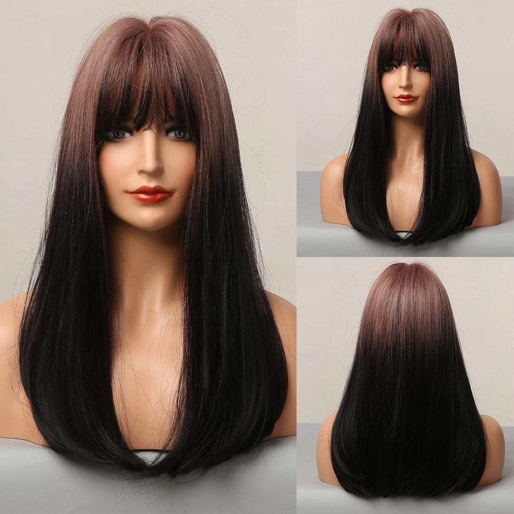Длинные прямые синтетические парики с челкой, Омбре, пепепельно-кор...