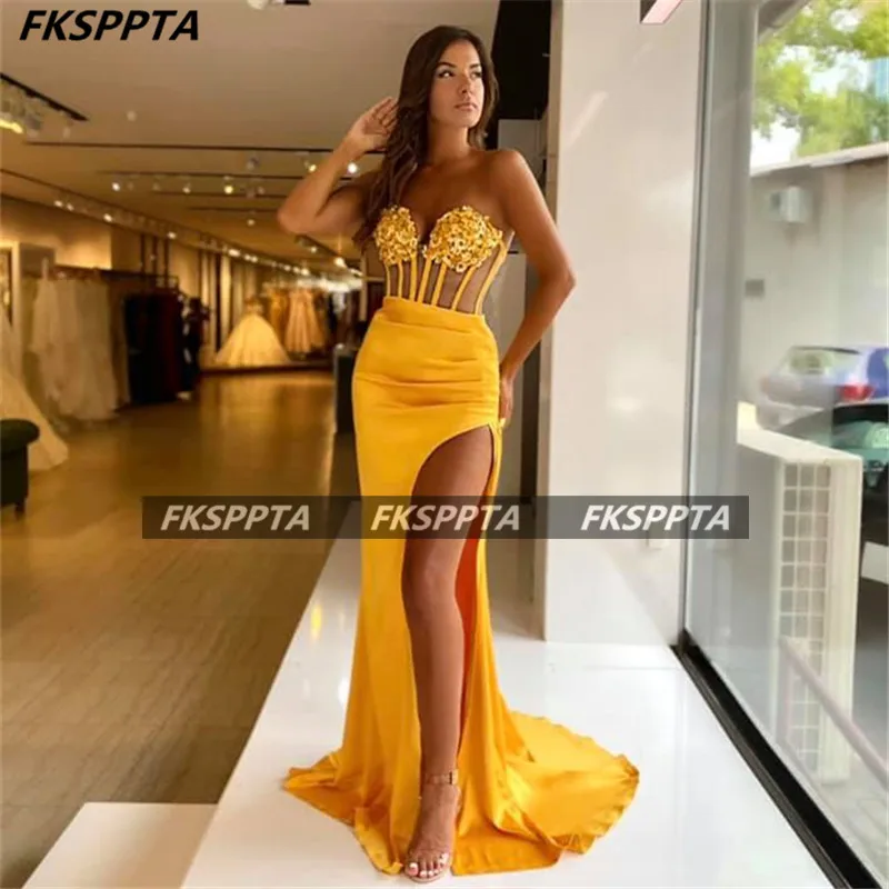 Соблазнительные длинные желтые золотые платья для выпускного вечера 2021, корсет с высоким разрезом, прозрачные женские платья с цветами для свадебной вечеринки
