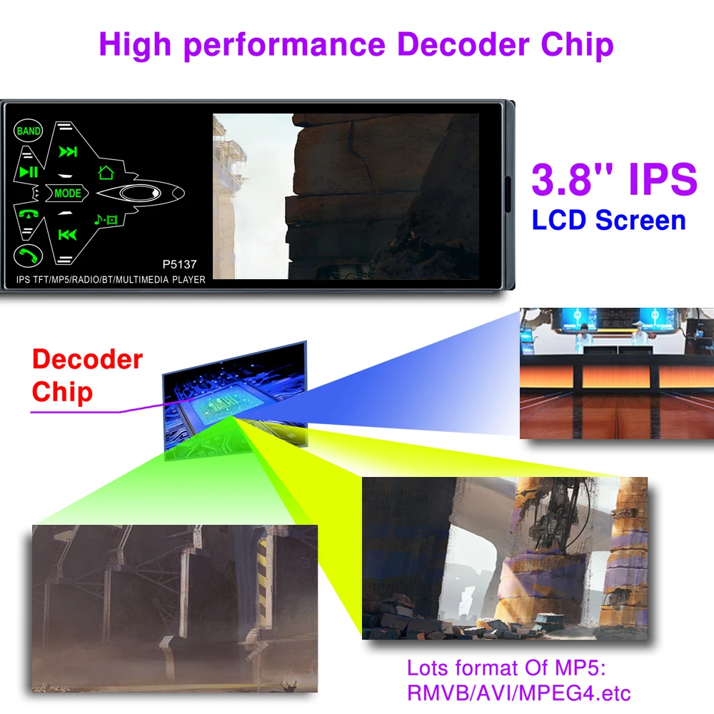 3,8 дюймов IPS 2.5D емкостный сенсорный экран.Подсветка 7 цветных кнопок.TP-C функции.2.5D изогнутое стекло.Поддержка формата воспроизведения аудио MP3/WMA/WAV/FLAC/APP и т. Д.Поддержка формата воспроизведения видео RMVB/RM/VOB/MP4/MOV/AVI /3GP и т. д.С передним портом USB2.0 и слотом для карт TF.Функция BT, бесплатный звонок и BT музыка.Усилитель на полевых МОП-транзисторах: 50 Вт x 4 Максимальная выходная мощность.Полный ИК-пульт дистанционного управления.Отключение питания с функцией автоматического хранения памяти в режиме радио или TF/USB.Функция часов.Функция отключения звука.Настройка эквалайзера/4 настройки баланса динамика.Функция переднего AUX in.Односторонняя функция видеовыхода.Две функции аудиовыхода RCA.Функция одностороннего ввода видео.Функция ввода камеры заднего вида (без камеры).Вход заднего микрофона.Выход сабвуфера.Функция управления рулем.Пульт управления рулем.Два usb-порта (одна воспроизведение музыки, одна поддержка быстрой зарядки телефона).Характеристики:Наименование товара:Тип: 1 DINРабочее напряжение: DC12VСопротивление динамика: 4 ОмМаксимальная мощность: 50 Вт * 4Регулятор громкости: +/ -8 дБ (бас 100 Гц, ВЧ 10 кГц)Размер: 188x85x58 ммДиапазон настройки FMAM RDSДиапазон настройки: 87,5-108 МГцЕсли частота: 10,7 МГцПрименимая Чувствительность: 15 дБSNR: 50 дБСтерео разделение: 30 дБЯзык: испанский, португальский, русский, итальянский, немецкий, французский, польский, турецкий, чешский, традиционный китайский, венгерский, японский, английский, китайскийПримечание:-Возможны небольшие погрешности в размере при ручном измерении.-Отклонение цвета может отличаться из-за различных настроек монитора, пожалуйста, поймите.Упаковочный лист