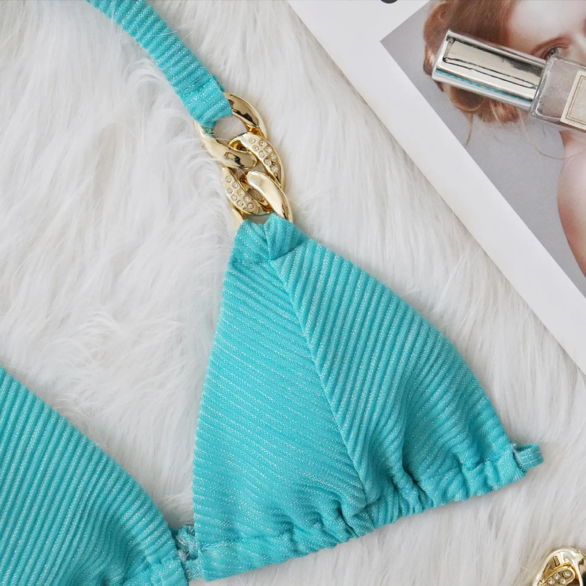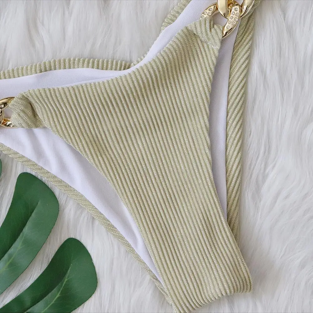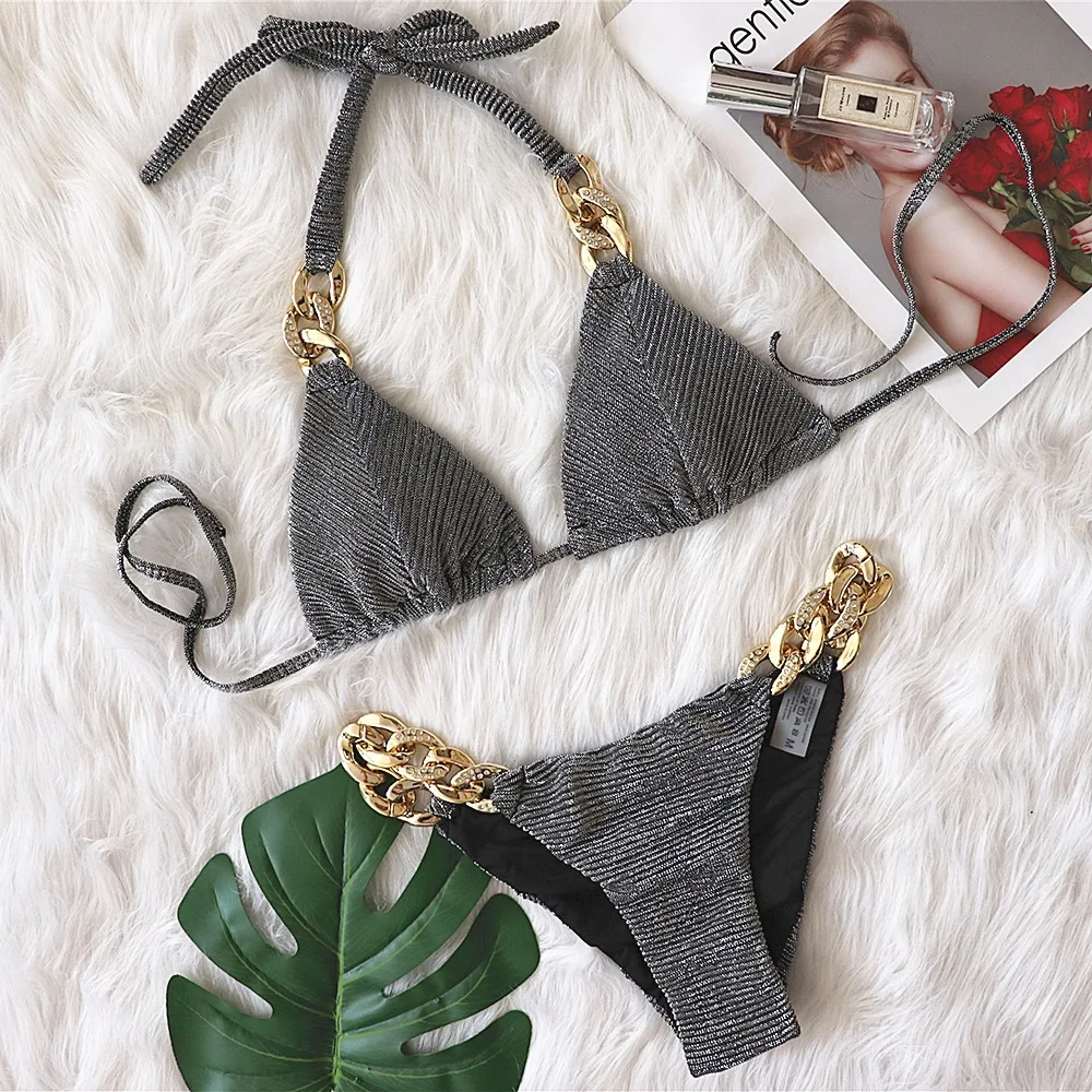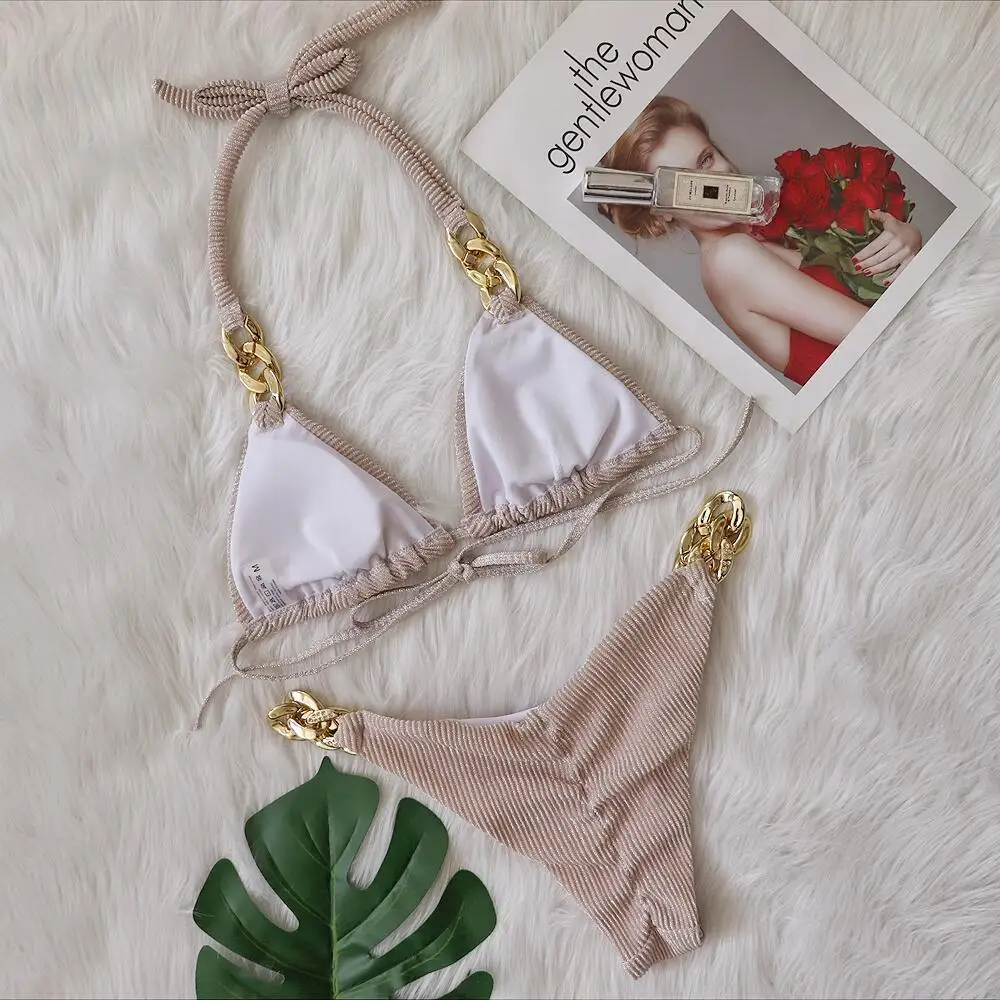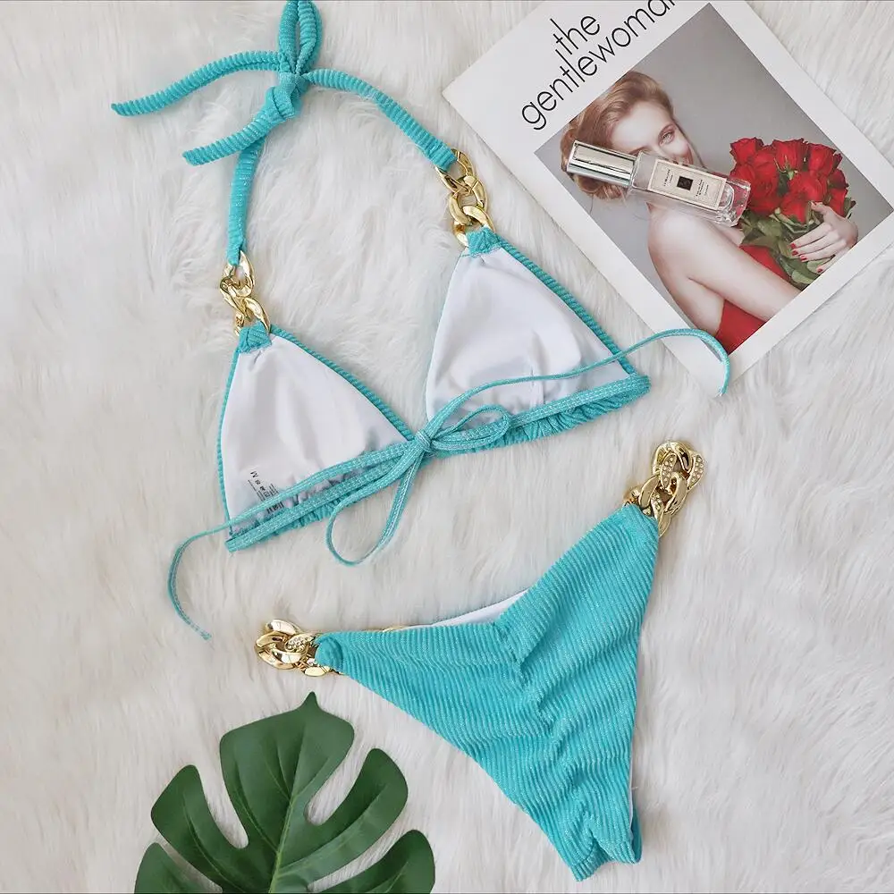 Бикини женское в рубчик с лямкой на шее, купальный костюм из двух предметов в бразильском стиле, с металлическими цепочками и кристаллами, бикини