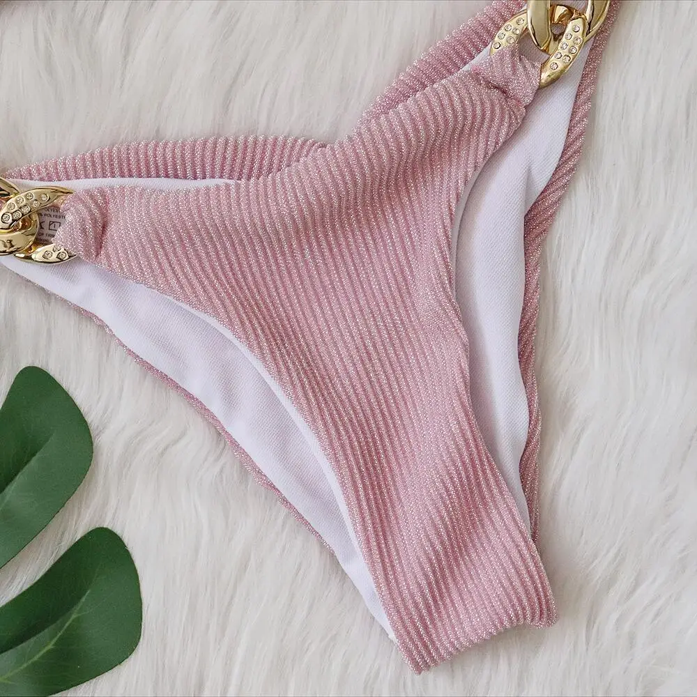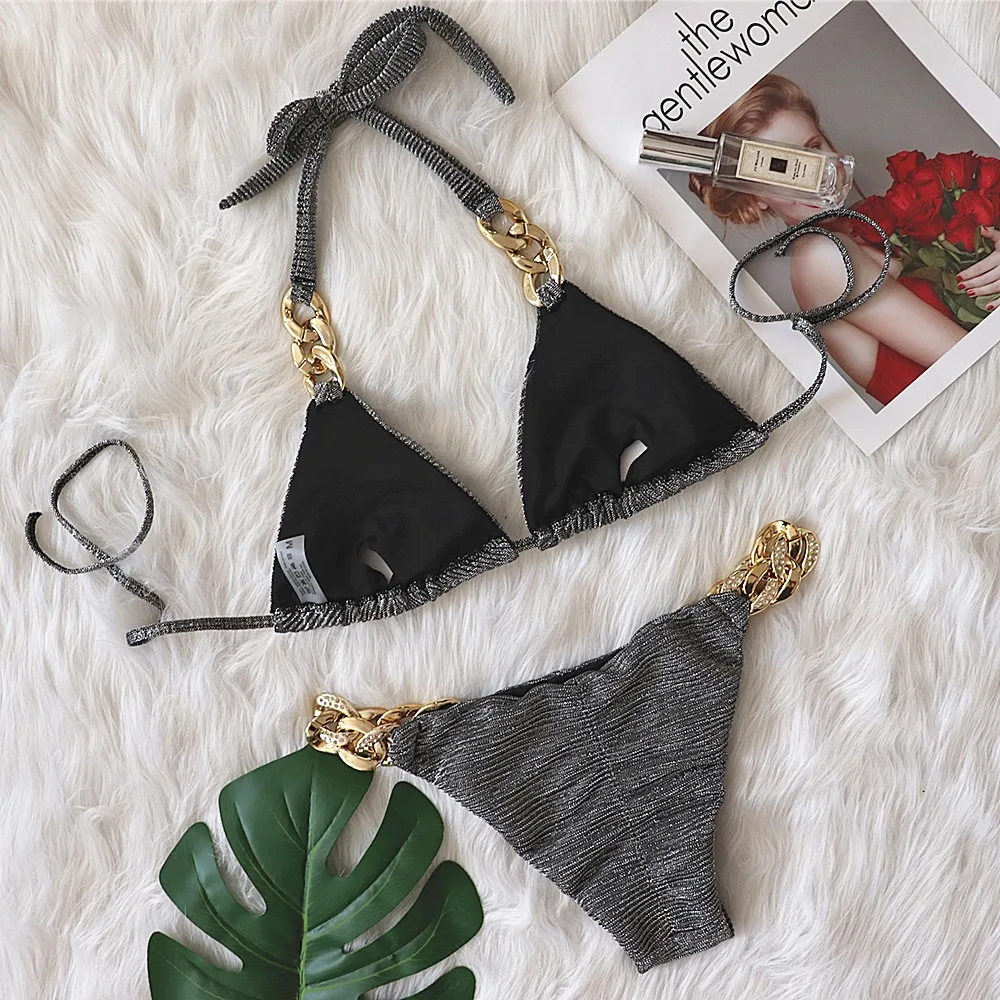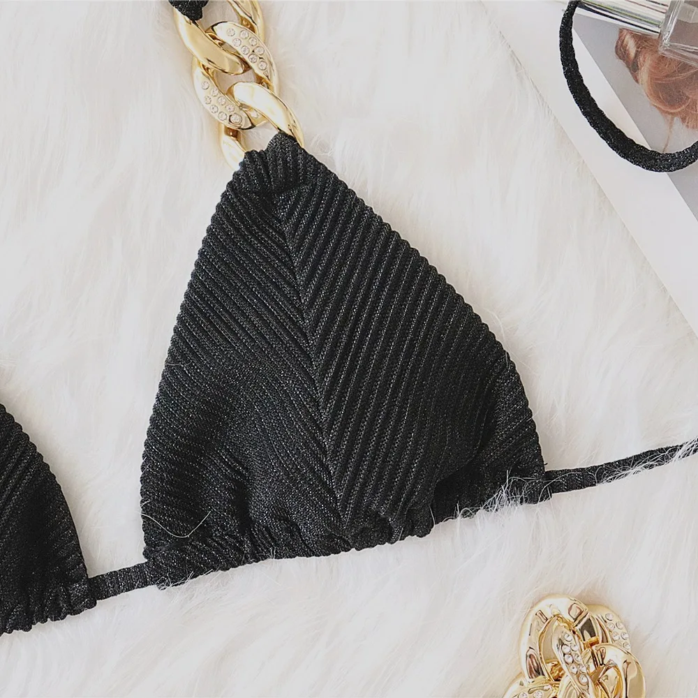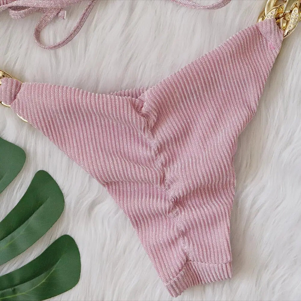 Бикини женское в рубчик с лямкой на шее, купальный костюм из двух предметов в бразильском стиле, с металлическими цепочками и кристаллами, бикини