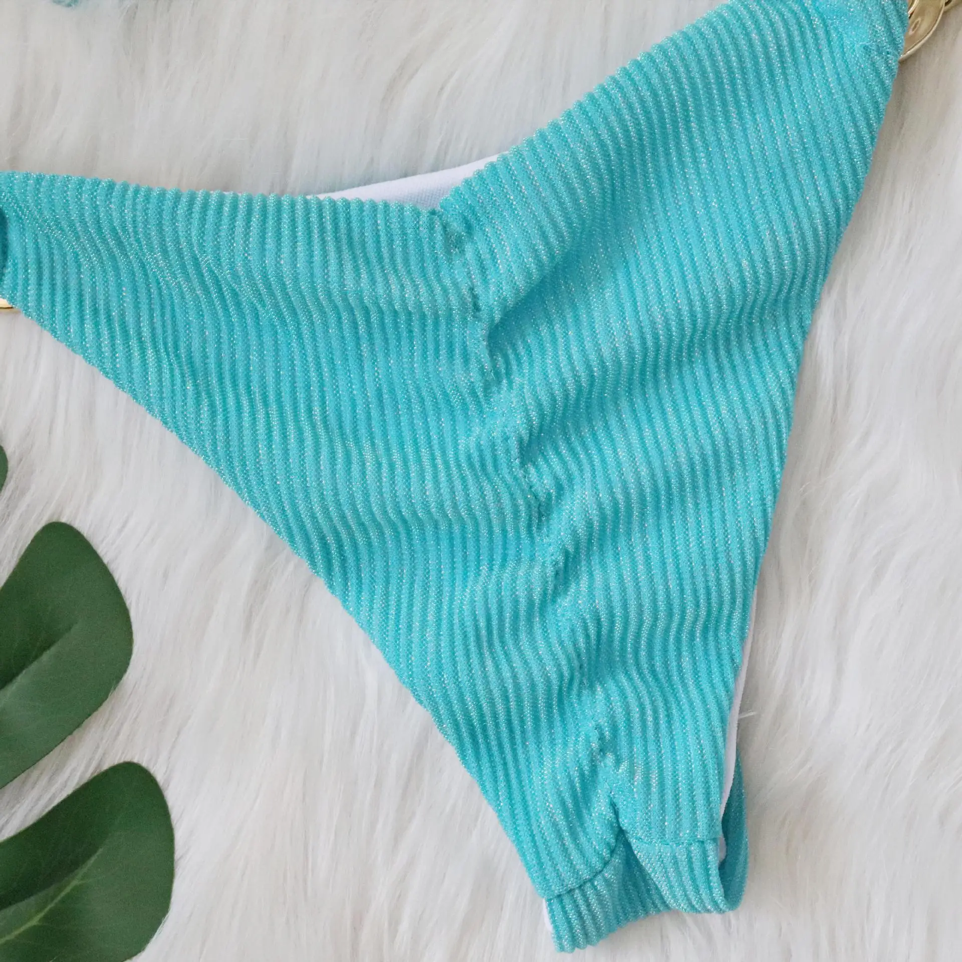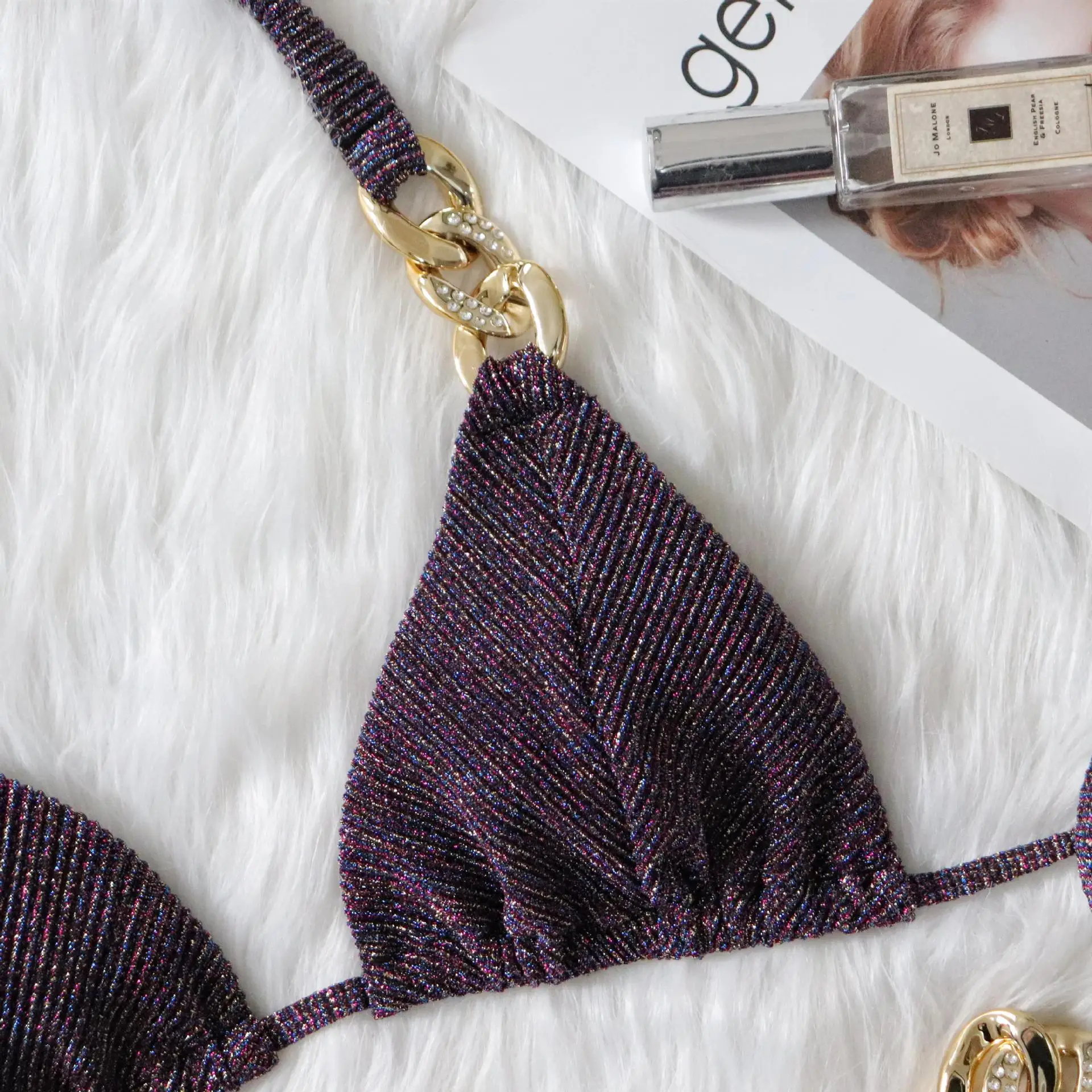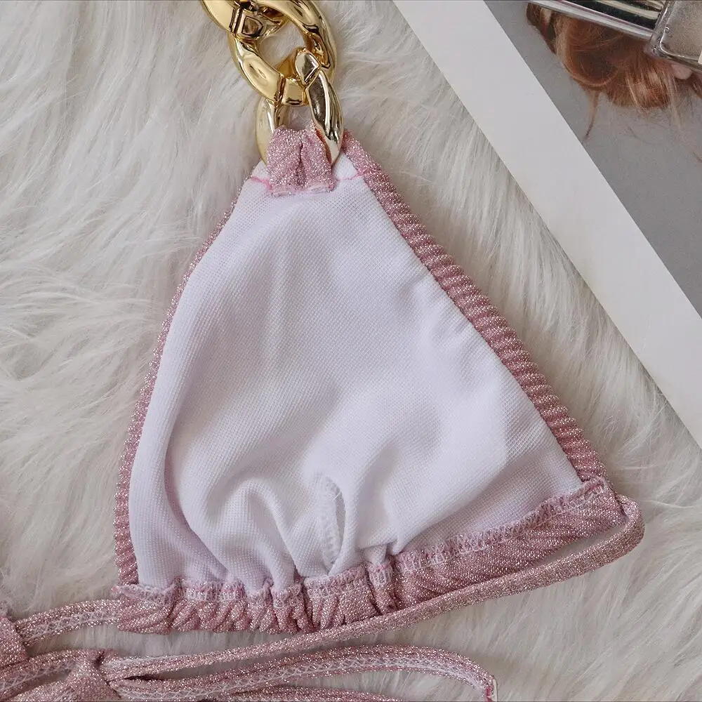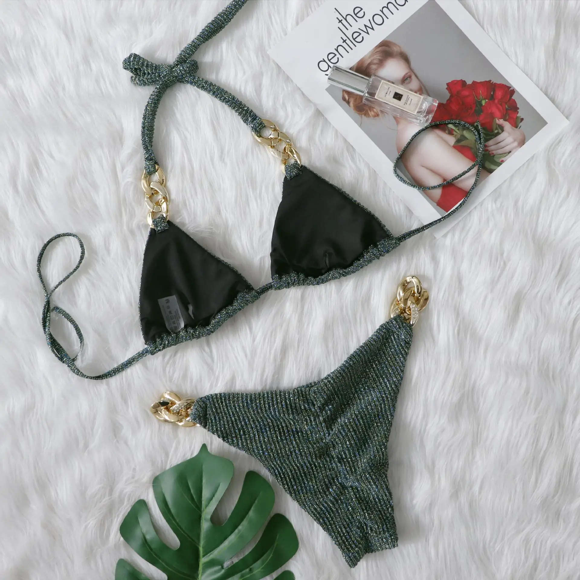 Бикини женское в рубчик с лямкой на шее, купальный костюм из двух предметов в бразильском стиле, с металлическими цепочками и кристаллами, бикини