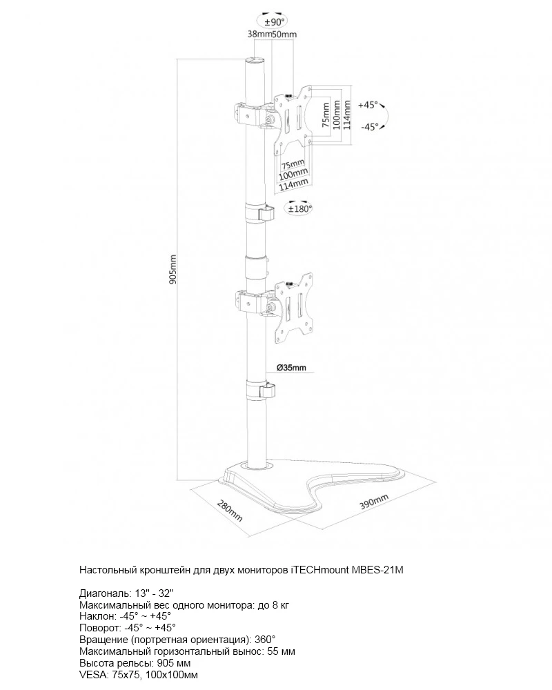 Настольный кронштейн для двух мониторов iTECHmount MBES-21M поможет быстро и надежно одновременно установить 2 монитора или телевизора на столе. Каждое посадочное место данной модели кронштейна рассчитано на мониторы и телевизоры диагональю от 13” до 32” , с максимальным весом каждого устройства до 8 кг . 4 степени свободы, позволят регулировать угол наклона каждого монитора в диапазоне 45° вверх и 45° вниз , угол поворота экрана до 90° в обе стороны, а функция вращения на 360° даст возможность легко менять ориентацию положения экрана из горизонтальной в портретную и обратно. Наличие кабель-канала позволит избежать беспорядка из свисающих и спутанных проводов, которые подключаются к устройству. Благодаря тщательно продуманному устойчивому основанию кронштейна, Вы можете быть уверены в безопасном размещении вашего устройства на столе, а в случае необходимости, сможете быстро и легко перенести кронштейн с устройством на другой стол.
