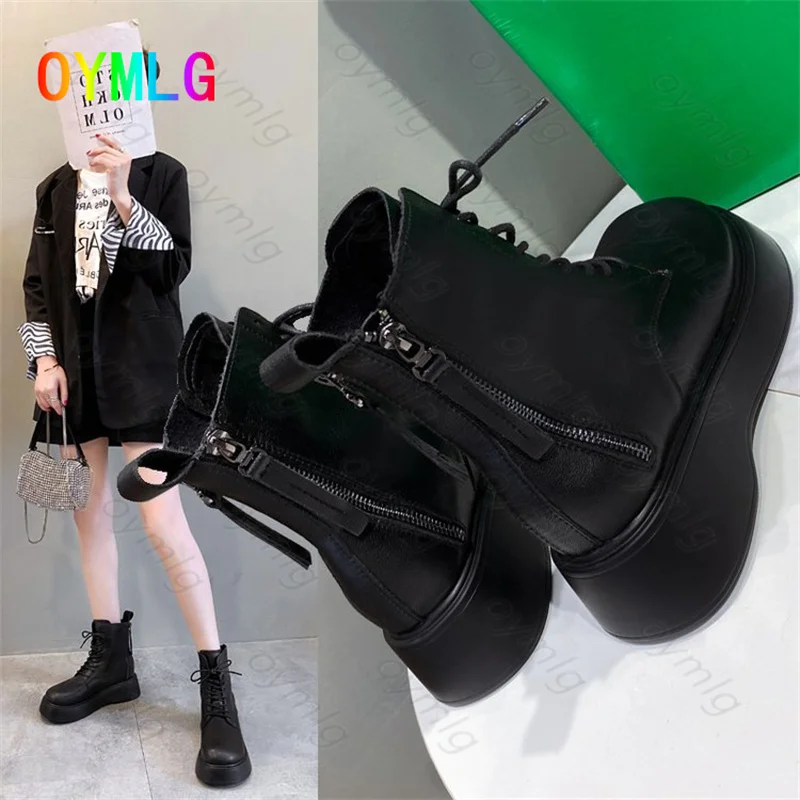 Женские кожаные ботинки на платформе, черные боевые ботинки до сере...