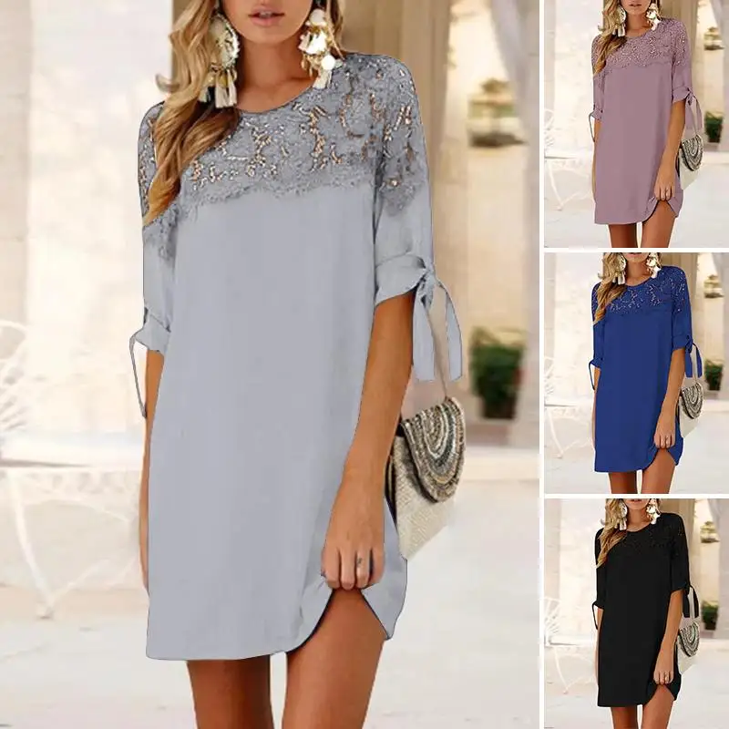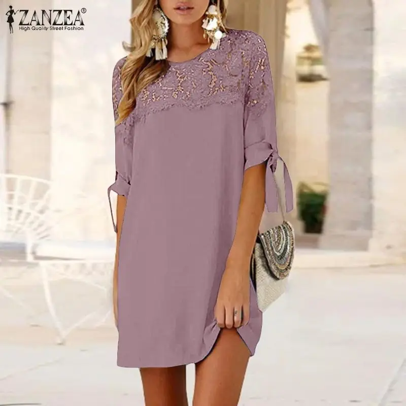 Летнее элегантное кружевное платье в стиле пэчворк, женское повседневное винтажное платье с длинным рукавом, сарафан ZANZEA, свободная верхняя одежда, однотонные женские платья