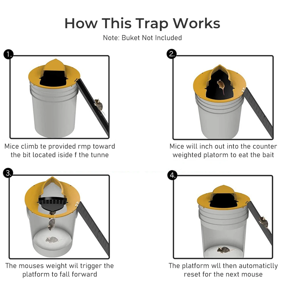 Ловушка для мыши с крышкой ковша с рампой, переверните, чтобы автоматически сбросить мульти-ловушку, совместимая с ведрами 5 галлонов, совместима с ловушками для мыши, гуманными или опасными ведрами