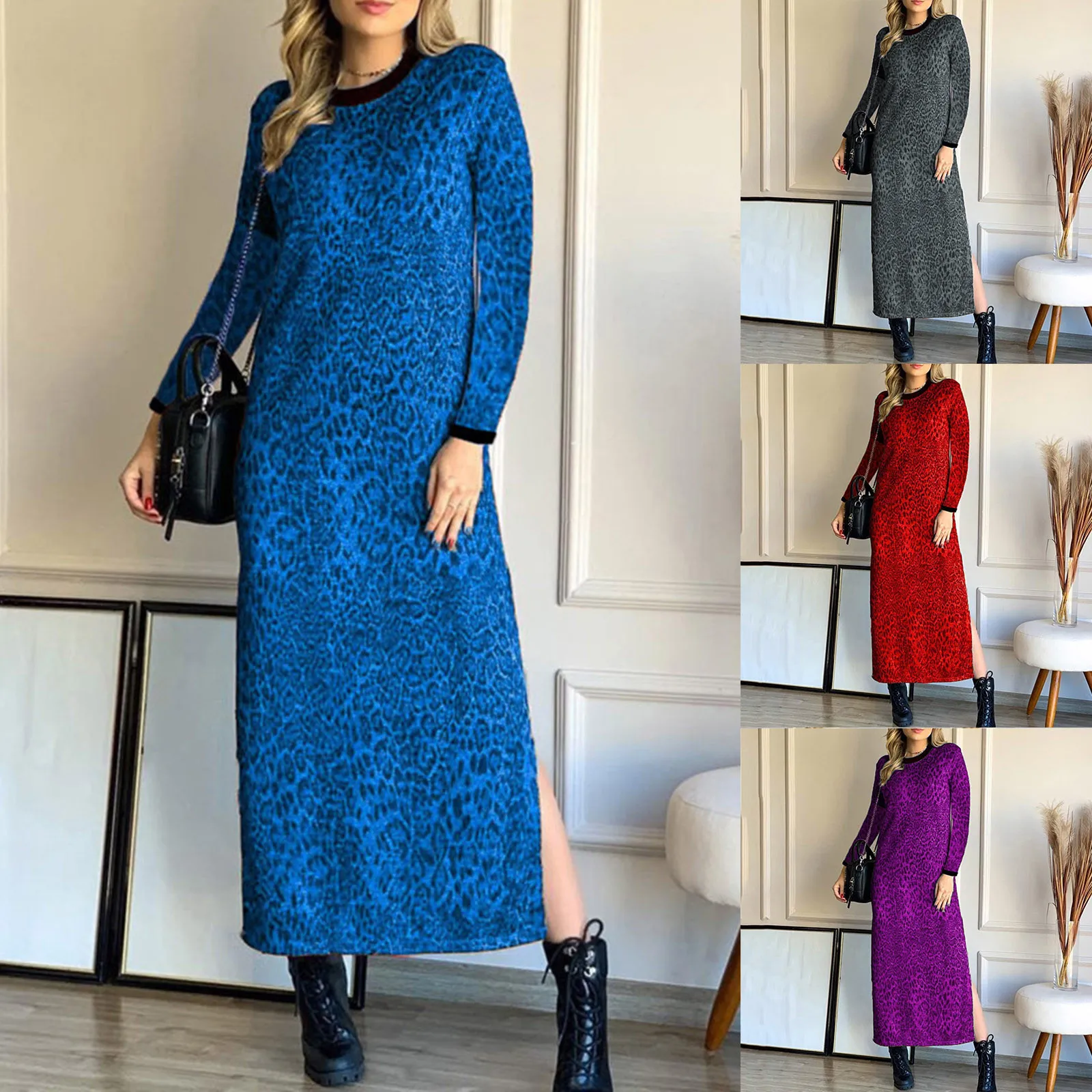 Осеннее Кружевное платье-макси с вышивкой и леопардовым принтом, женские винтажные платья в стиле бохо с длинным рукавом и круглым вырезом и разрезом, элегантные платья для женщин