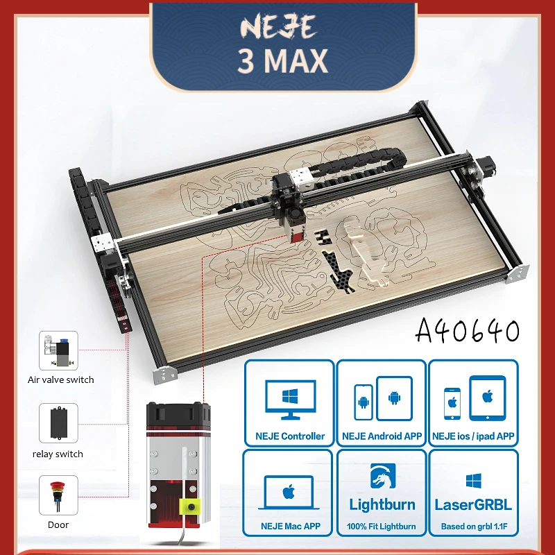 NEJE 3 Max-это профессиональное оборудование для лазерной гравировки и резки. Площадь 810x460 мм может удовлетворить большинство потребностей в гравировке и резке. Благодаря удлинительному стержню, обеспечиваемому NEJE, может быть получена Рабочая площадь 810x1030 мм. NEJE 3 серии все поддержка APP управление и точность контроля, до 0,01 мм, вы можете получить максимальную гравировка работает с помощью программного обеспечения, таких как приложение и Лайтберн. С полнофункциональным модулем NEJE A40640, он наиболее подходит для гравировки из нержавеющей стали, гравировки камня, искусства рельефа дерева, брезентового искусства большой площади, резки листа, акрила, ткани идеальный выбор. NEJE 3 Max оснащен автоматическим воздушным ассистентом, компонентами автоматического контроля дыма и расширенными функциями двери безопасности и совместим со всеми модулями серии NEJE. Расширенные функции идеально подходят для приложений Lightburn, laserGRBL и NEJE. Создайте идеальную систему лазерной гравировки и резки, NEJE 3 Max также поставляется с опциональной сотовой панелью, поддерживает все вращающиеся приспособления, улучшает качество резки и различные формы материалов. NEJE 3 Max всегда может принести шокирующие работы, а мощная возможность расширения-это обязательный инструмент для профессиональных любителей диодного лазера.