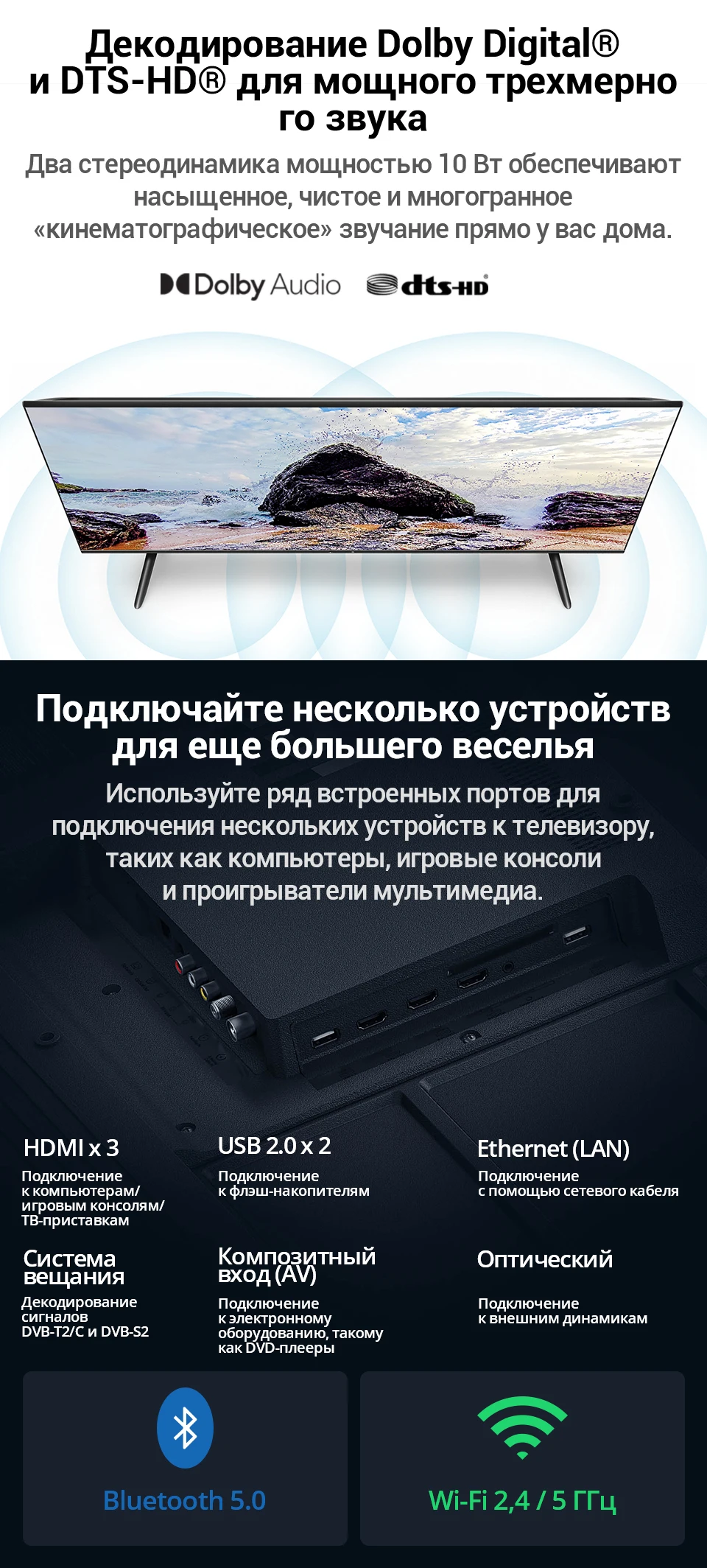 Обычная сверхбюджетная модель китайского разработчика и российской сборки со всеми ,, вытекающими " . Если коротко то для комнаты отдыха в бане загородного дома сойдёт но не более . Теперь о недостатках : авто настройка каналов быстрая и точная НО нумерация каналов после настройки вообще непонятная , все каналы разбросаны под разными номерами хаотично . Что - вручную теперь их 220 штук настраивать как у всех других ТВ ? ( кстати пока и в меню не нашел как это сделать ) . Встроенный звук громкий но дешевоотвратительный , без саундбара не обойтись . Изображение - здесь вообще печаль . Причем что то улучшить не получается даже через расширенное меню ручных настроек .Засветы в верхних углах и полное отсутствие черного !( ну совсем его нет ). Правда если при просмотре с внешнего носителя это не так заметно то при просмотре эфирного кабельного ТВ очень посредственное качество картинки .Хотя надо признать СМАРТ работает отлично но к чему он если изображение никуда негодное .
