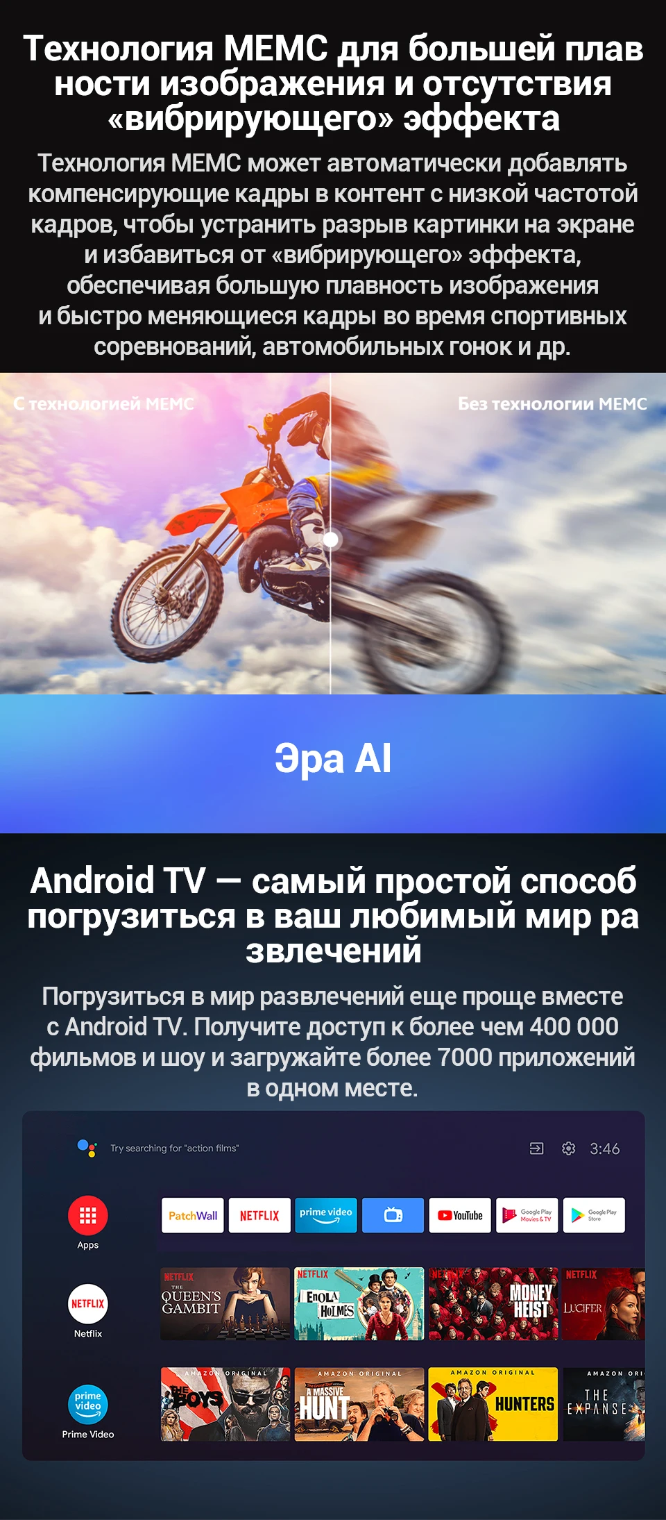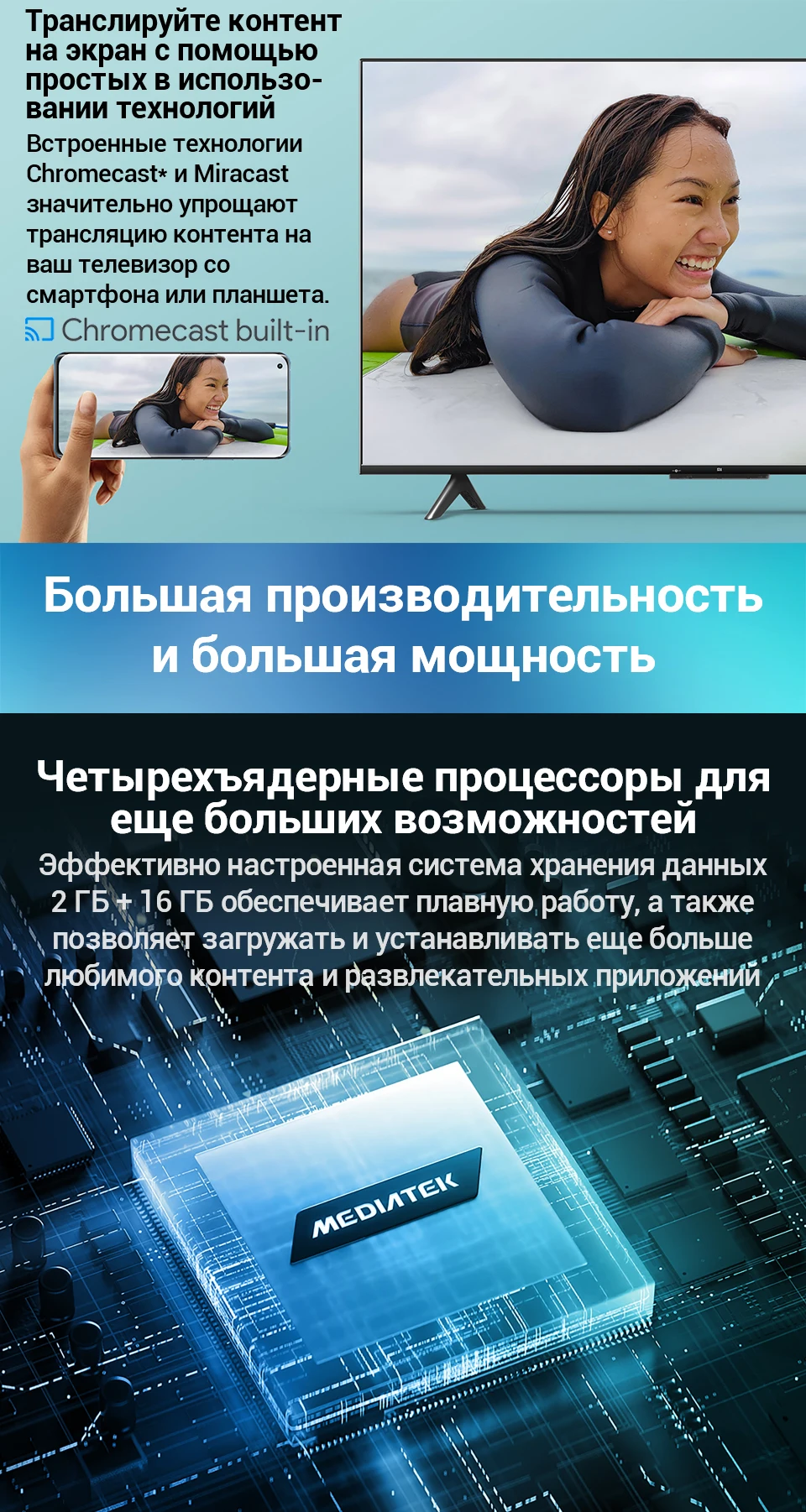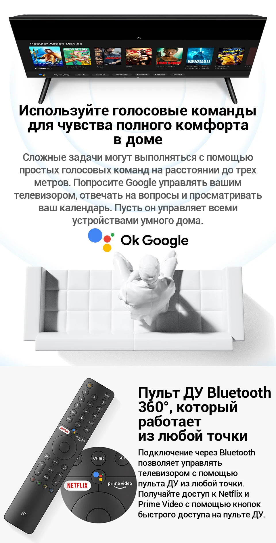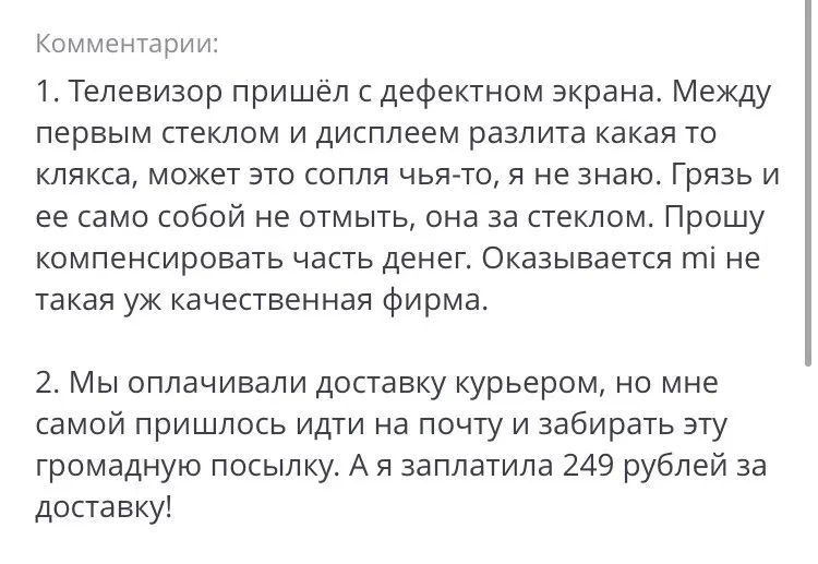 Не советую! Посмотрите фото прикреплённые и подумайте , нужно ли вам это … Между стеклом какая то сопля , ее конечно же не отмыть и не достать. Ощущение будь то тв после ремонта. Не ведитесь на скидку! Покупали за 43200 р. Оплачивали доставку курьера , а он и не доставил!:) пришлось на почту идти самим и забирать. ТВ глючит сильно! Когда смотришь кино , и что то говоришь тихо между семьей , включается голосовой ассистент, выключает кино и перекидывает на ютуб :) Смех! Хотя слов Ок Гугл не было :) ребята , купите лучше в магазине такой товар , пусть и на пару тысяч руб по дороже. Как сломается полностью , дополню отзыв :)