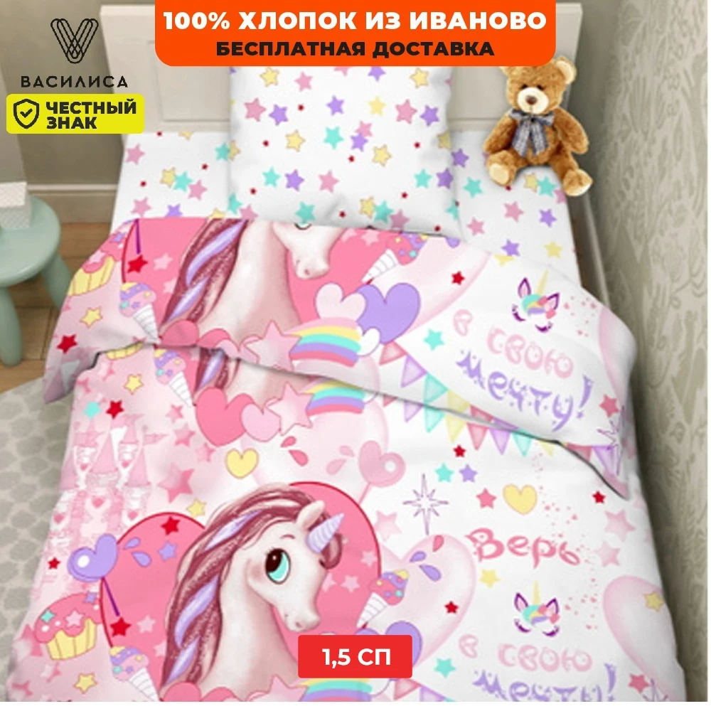 Доставка быстрая, комплект белья очень понравился, хлопок. Но размер не 2 сп., а 1,5 сп. В комплект входит 1 наволочка, 1 пододеяльник и 1 простыня. Дочке тоже понравилось, рисунок как на картинке