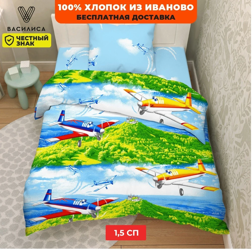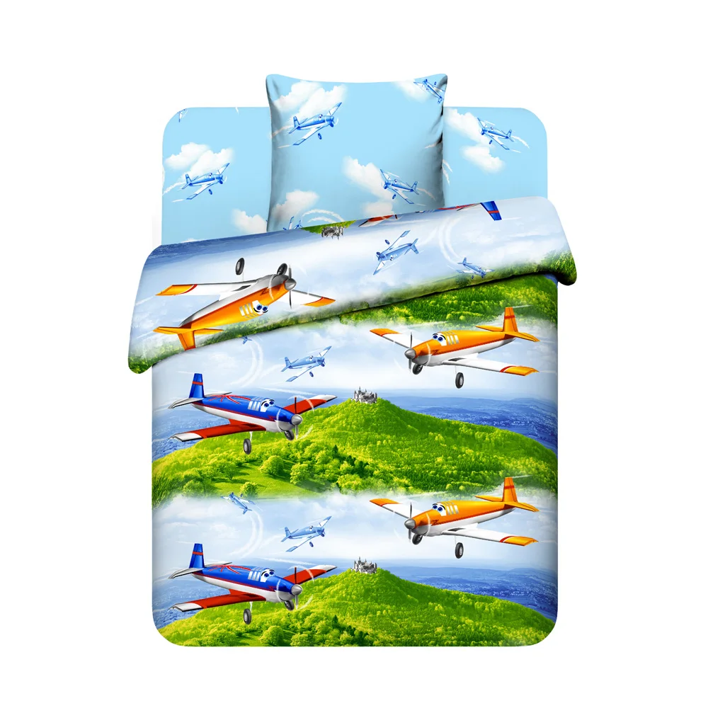 Комплект постельного белья украшен изображениями самолетов, парящих в небе. Такой комплект идеально подойдет для кроватки вашего ребенка. На нем ваш малыш будет спать здоровым и крепким сном.