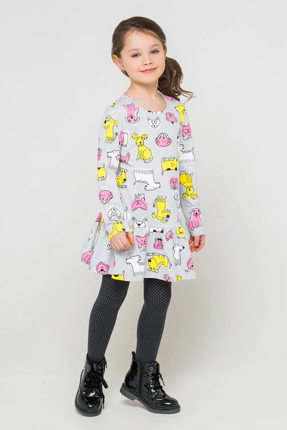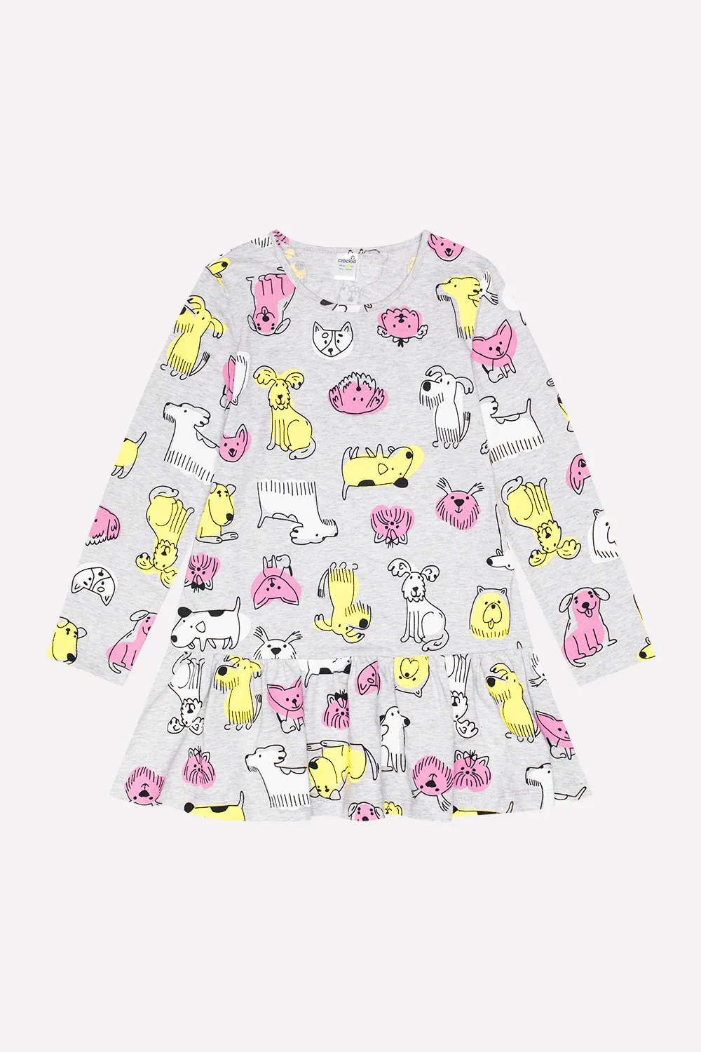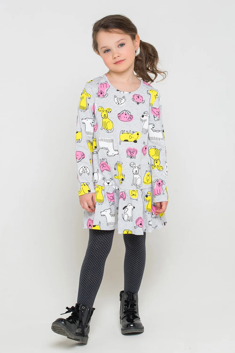 Описание Описание: Платье из меланжевого трикотажа супрем с набивным рисунком. Длинные рукава. Заниженная линия талии, отрезная юбка на сборке.
